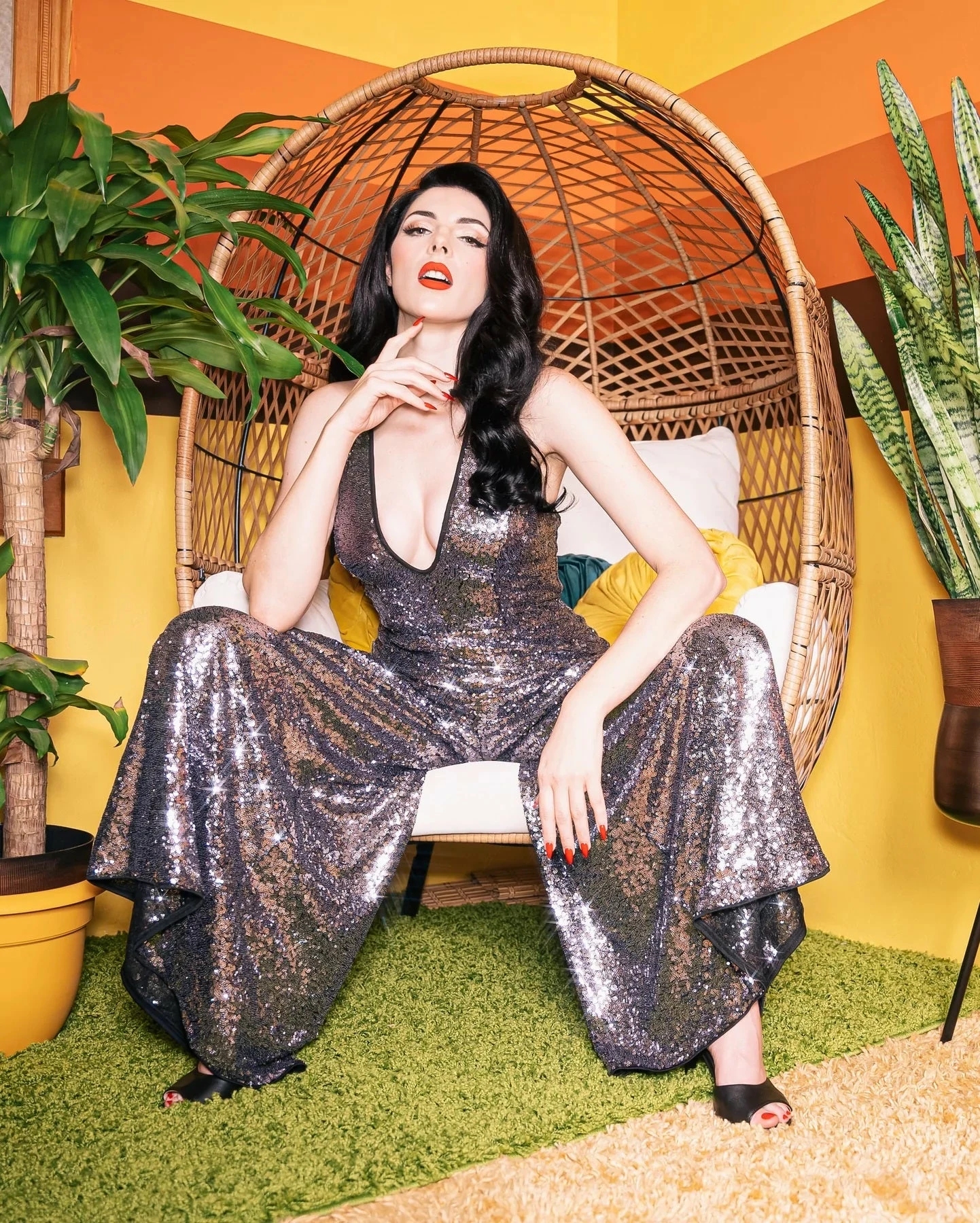 Our best selling Limelight jumpsuit is BACK in a sparkly new get up! Inspired by the wide leg jumpsuits of the 1970s, this jumpsuit features a plunge neck with a multi-way strap (Straight, cross or halter) with a straight back high enough to conceal your bra. The fit on this jumpsuit flatters all bodies, with its A-line wide legs and long rise, plenty of room for longer torsos and all the curves! Our Limelight jumpsuit sells out every time, and this sequin version will be no different, snag yours before she’s gone!