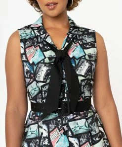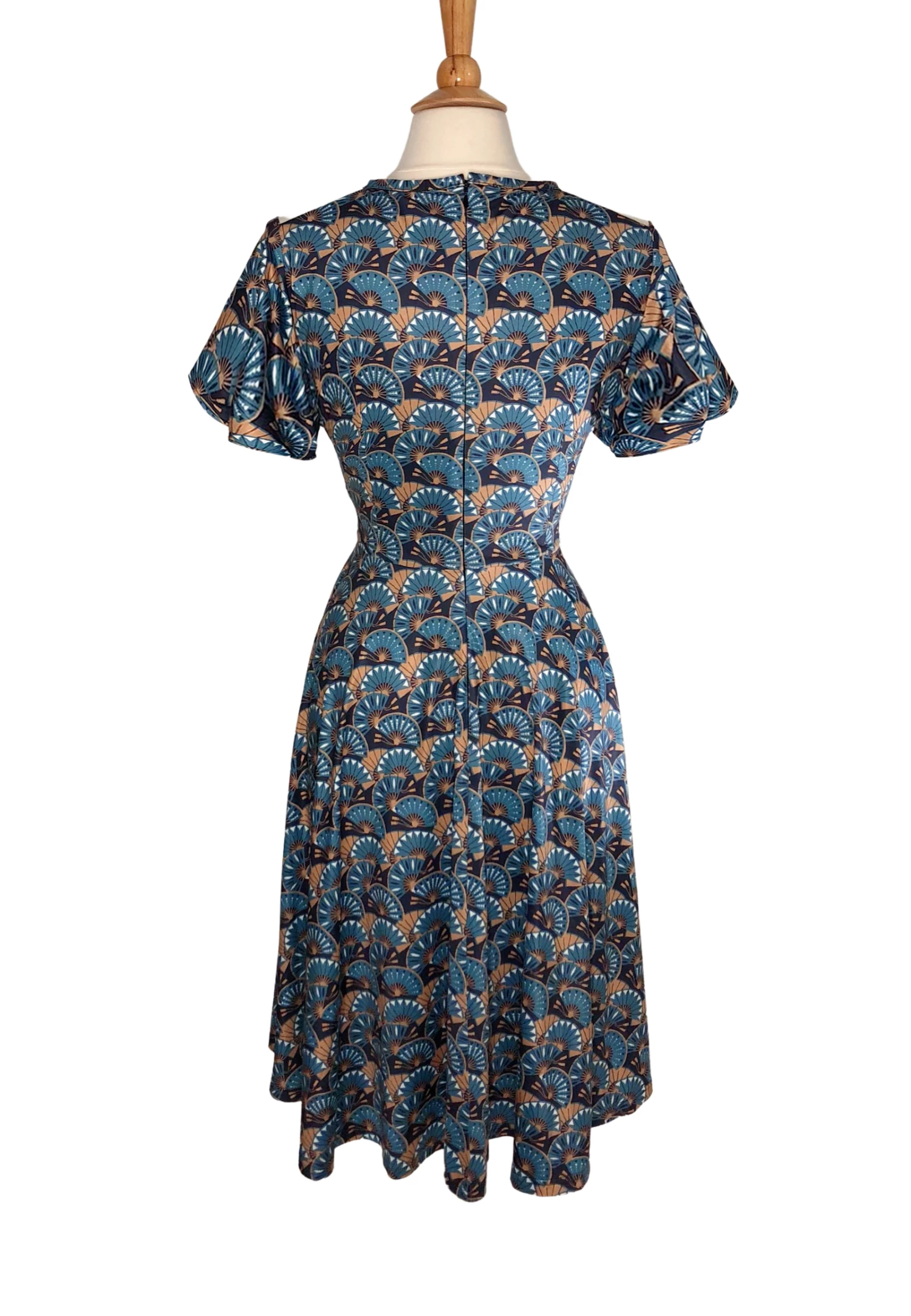 This 1940s style A-line dress features a cut out neckline and flutter sleeves in the adorable Japan Fan Print.