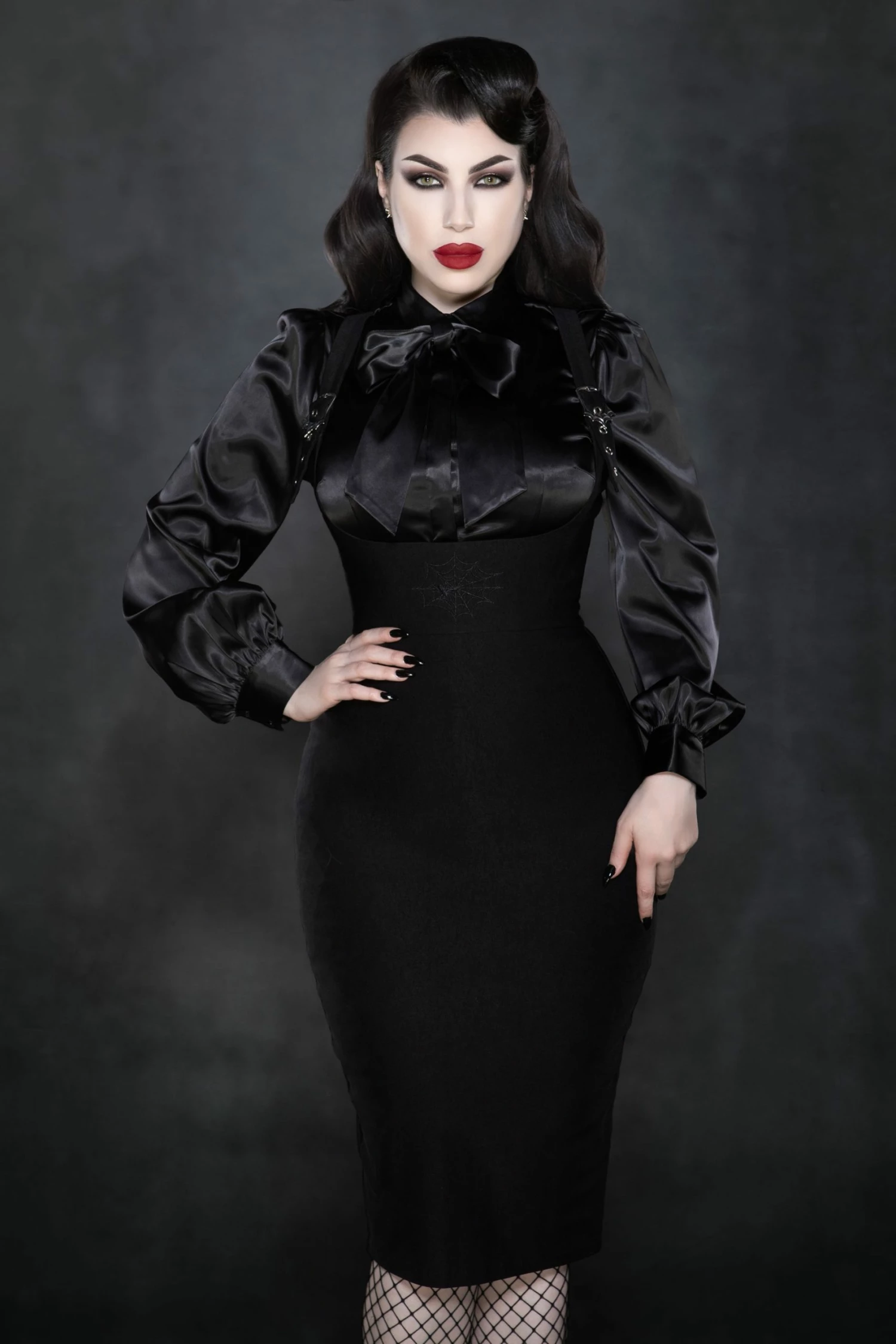 For easy wear, the Webbed Suspender Skirt is fitted with adjustable straps and a convenient back zipper.