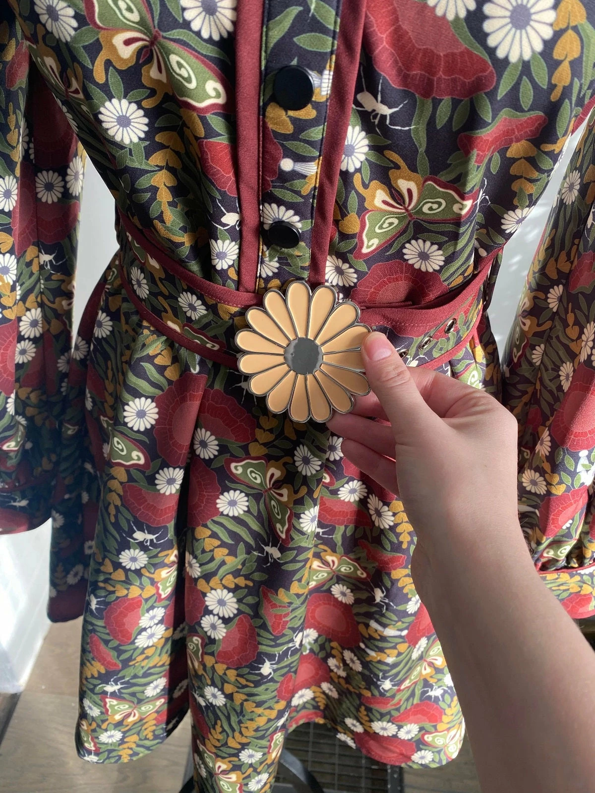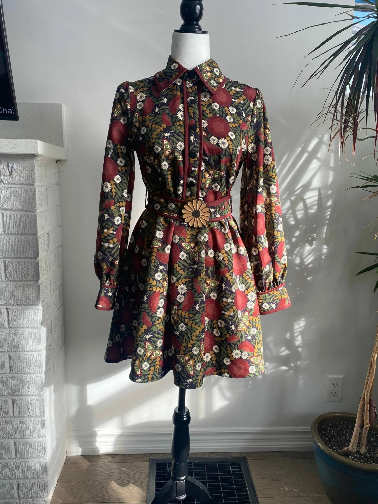 60s inspired custom printed dress. Available in Dark Floral or Light Floral. Skater Style. Side Seam Pockets. Removable belt with custom made Belt buckle. Mock frontal buttons. Back Zipper. Oversized collar.