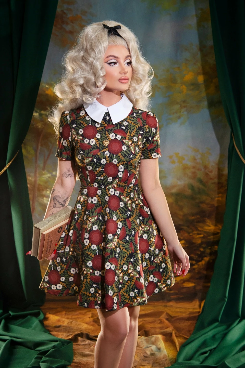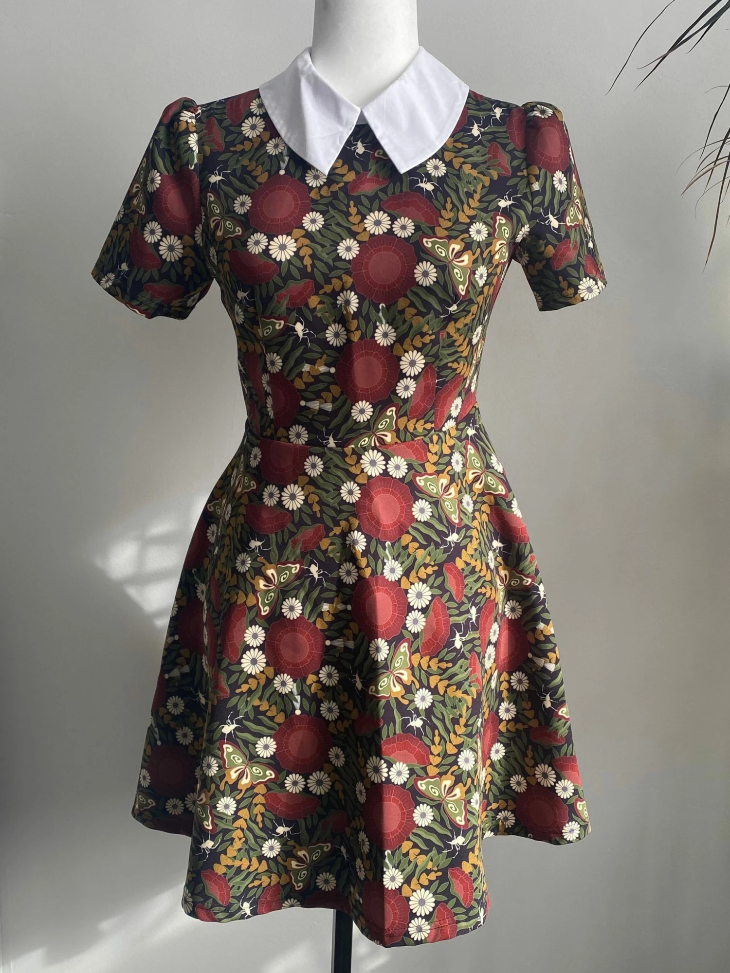 40s inspired dress with tassel collar. Comes with matching belt and features an accordion skirt. Back zipper. Great to up sale the item with our floral collar tips.