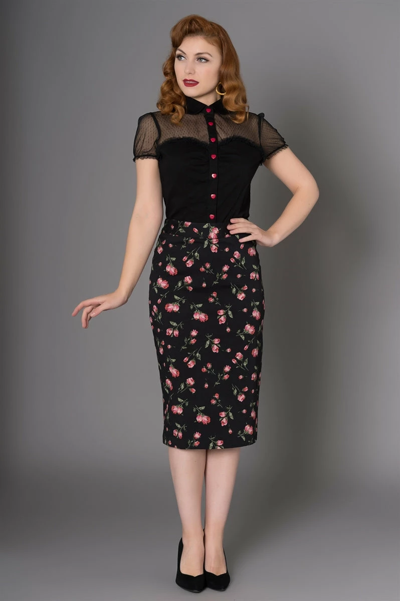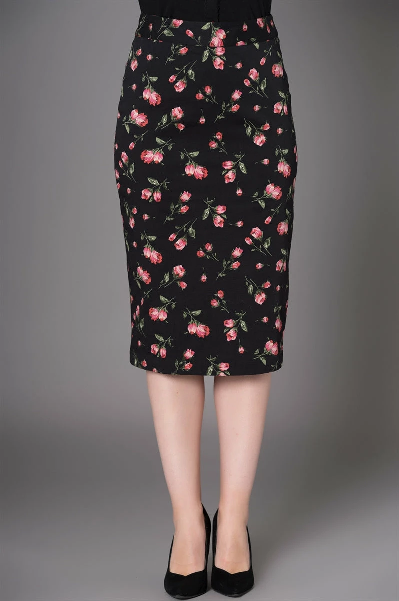 Ladies classic Natasha Pencil skirt in black with pink floral print
