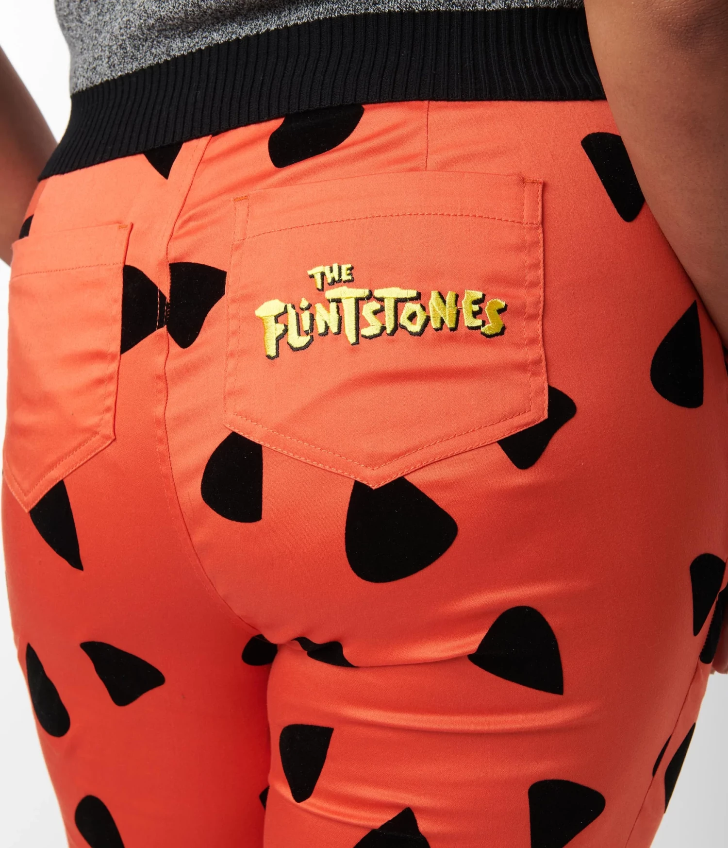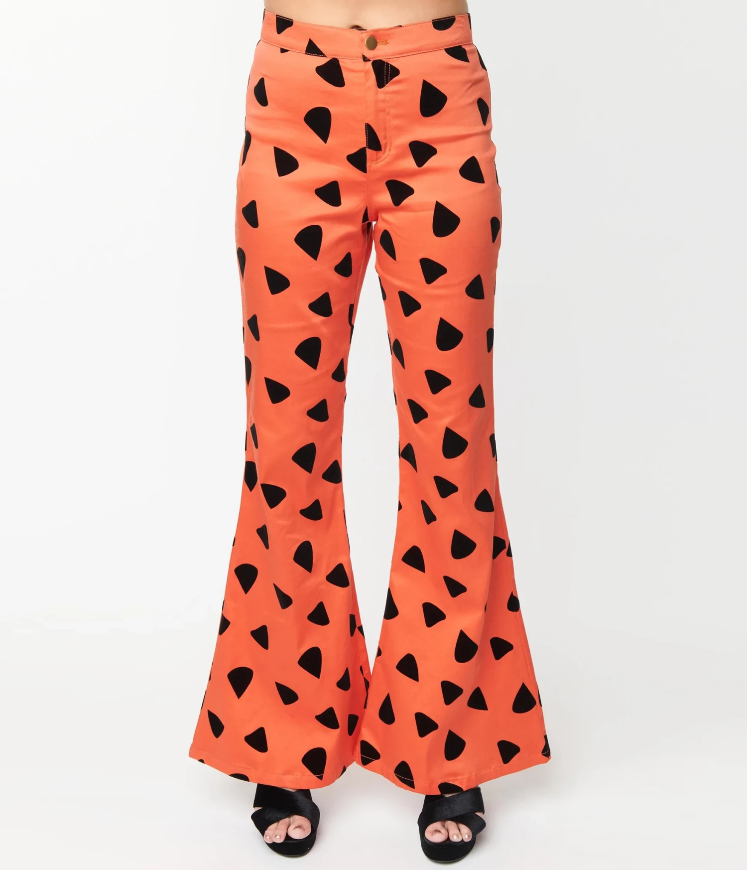 These eye-catching pants are crafted in a woven fabric boasting an orange and black leopard spot print of Fred Flintstone’s clothes. The banded waist is cinched with a front fly zipper and button as the retro legs drop into a dramatic flare for true retro styling, while the back pockets offer places to hold all your goodies!