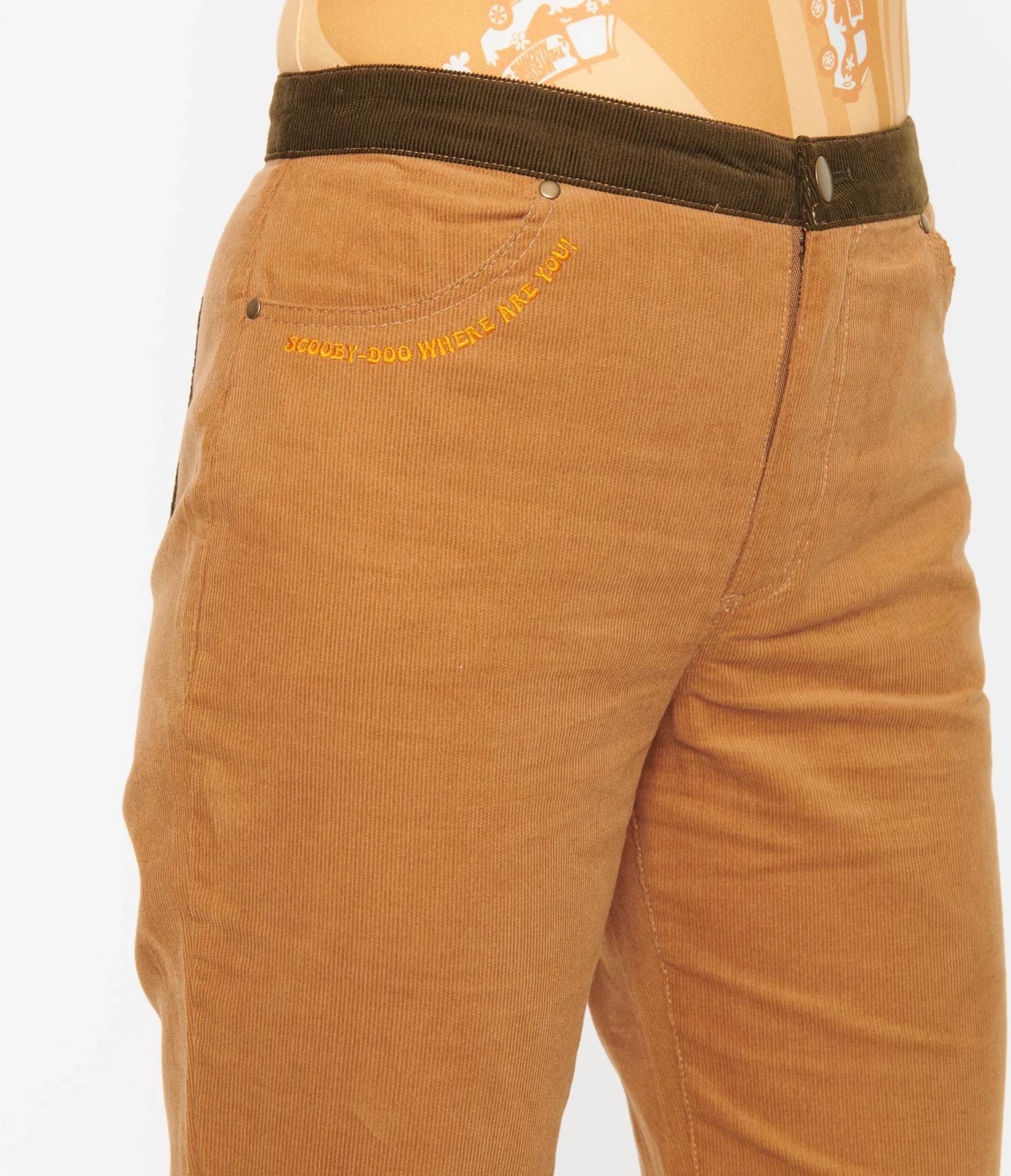 These groovy pants are crafted in a fabulous brown corduroy. The green banded waist is cinched with a front fly zipper and button as the retro legs drop into a dramatic flare. One front pocket is accented with embroidery reading ‘Scooby-Doo where are you!’, while the back pocket is embroidered with Scooby himself!