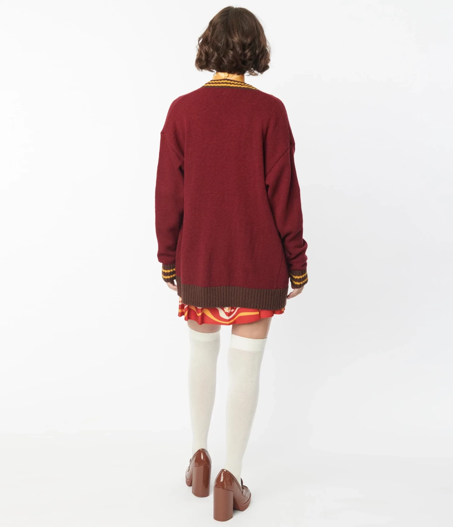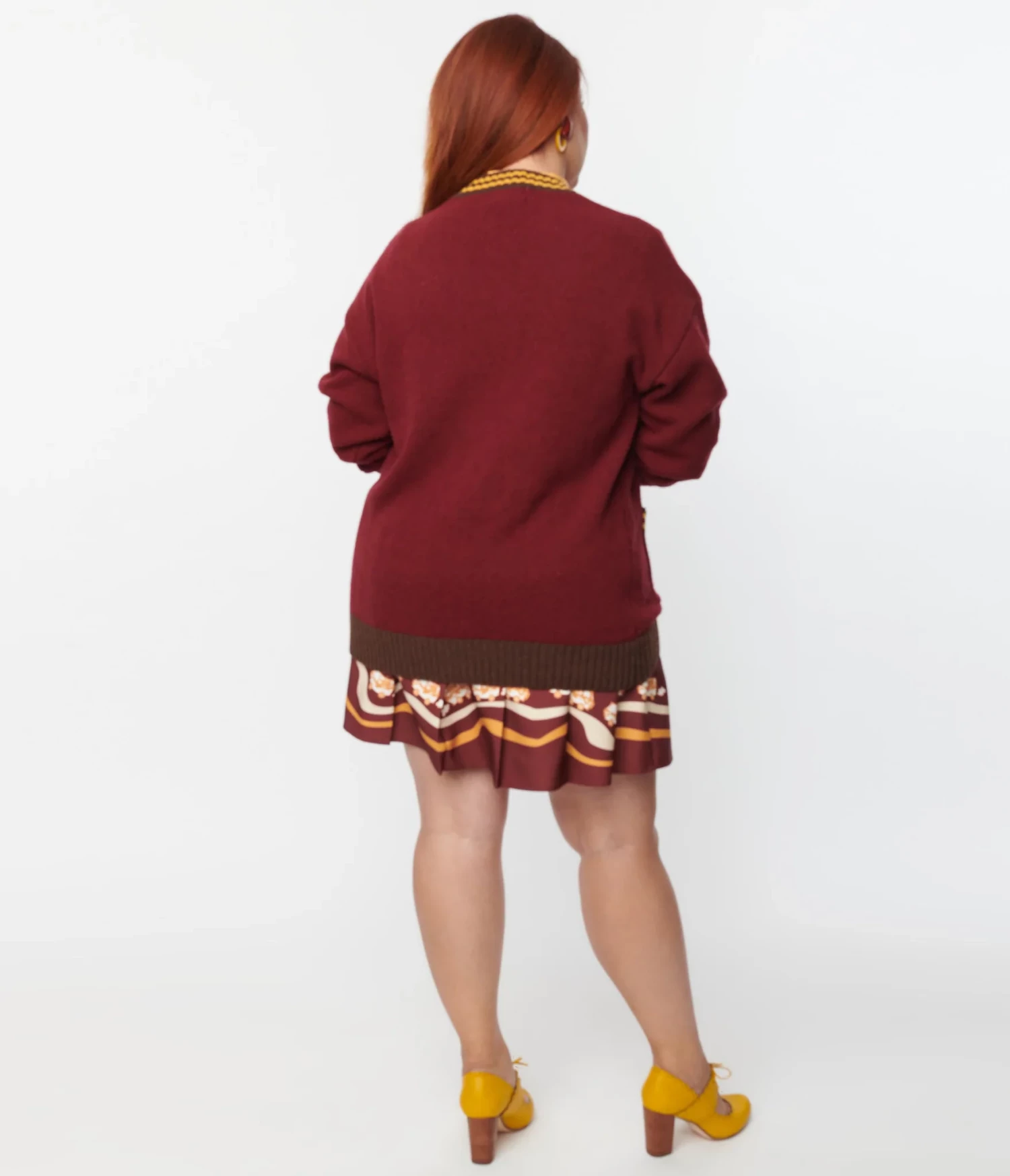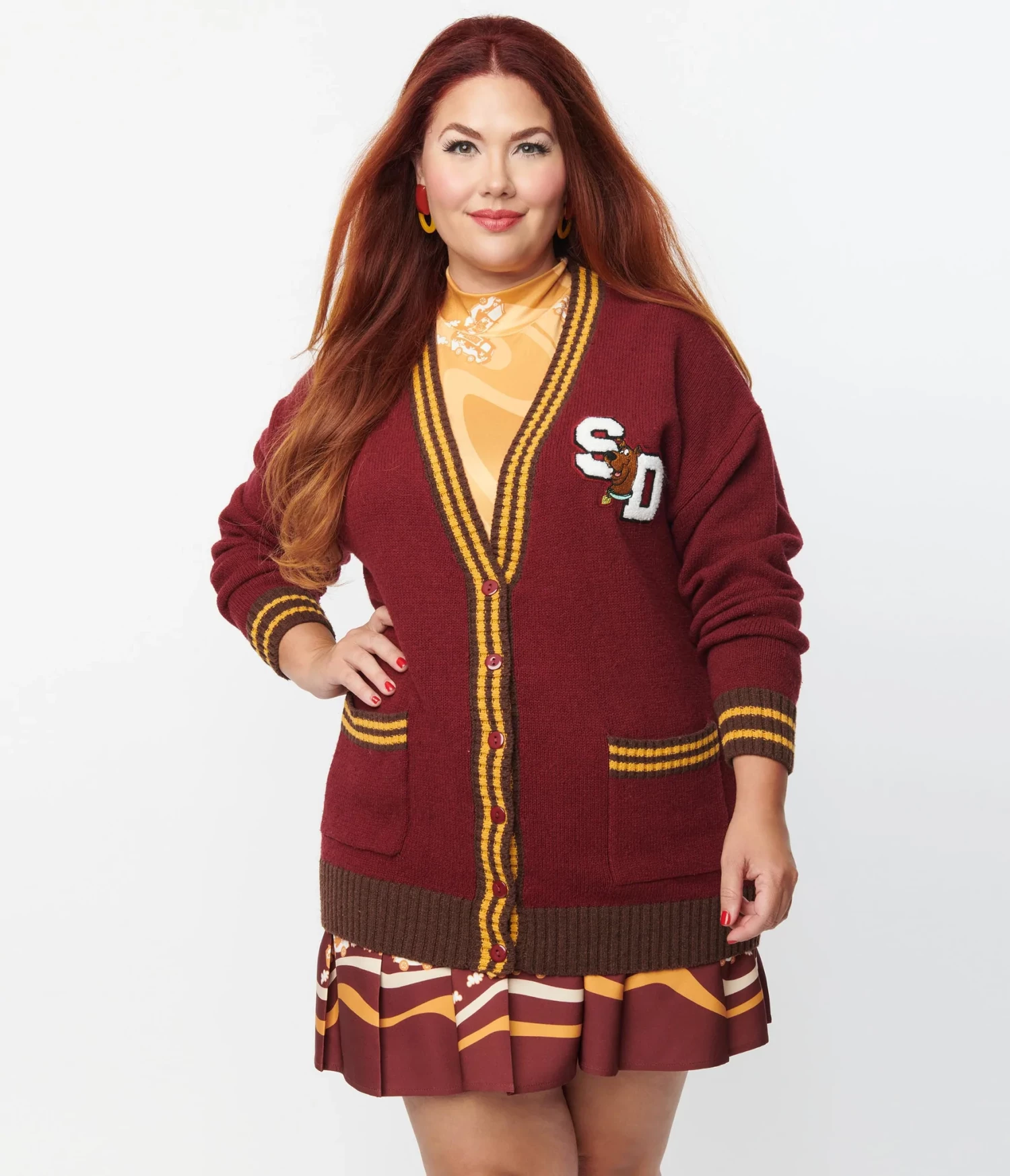 A cozy cardigan in collaboration with Scooby Doo, this piece is crafted in a soft Burgundy knit. Complete with a button up front, side pockets, and a Scooby Doo patch.