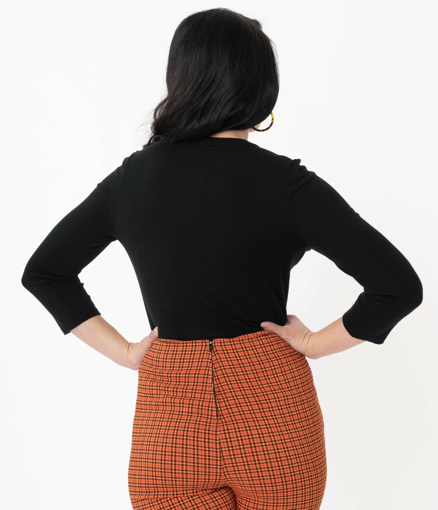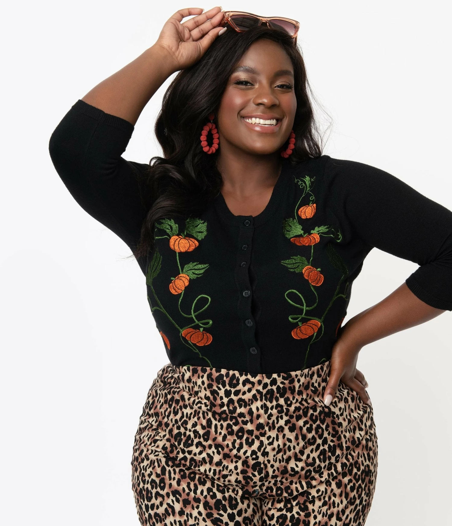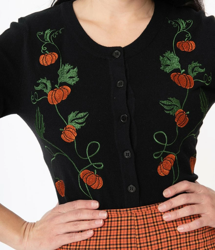 Prepare to be devoured, darling! An incredibly soft black knit cardigan from Unique Vintage, this spooky separate is a perfect piece to keep you warm on your evening strolls. The Bookworm Cardigan features adorable orange embroidered pumpkins dancing throughout while the button up front leads to a modest scoop neckline while the three-quarter length sleeves provide bewitching enchantment!