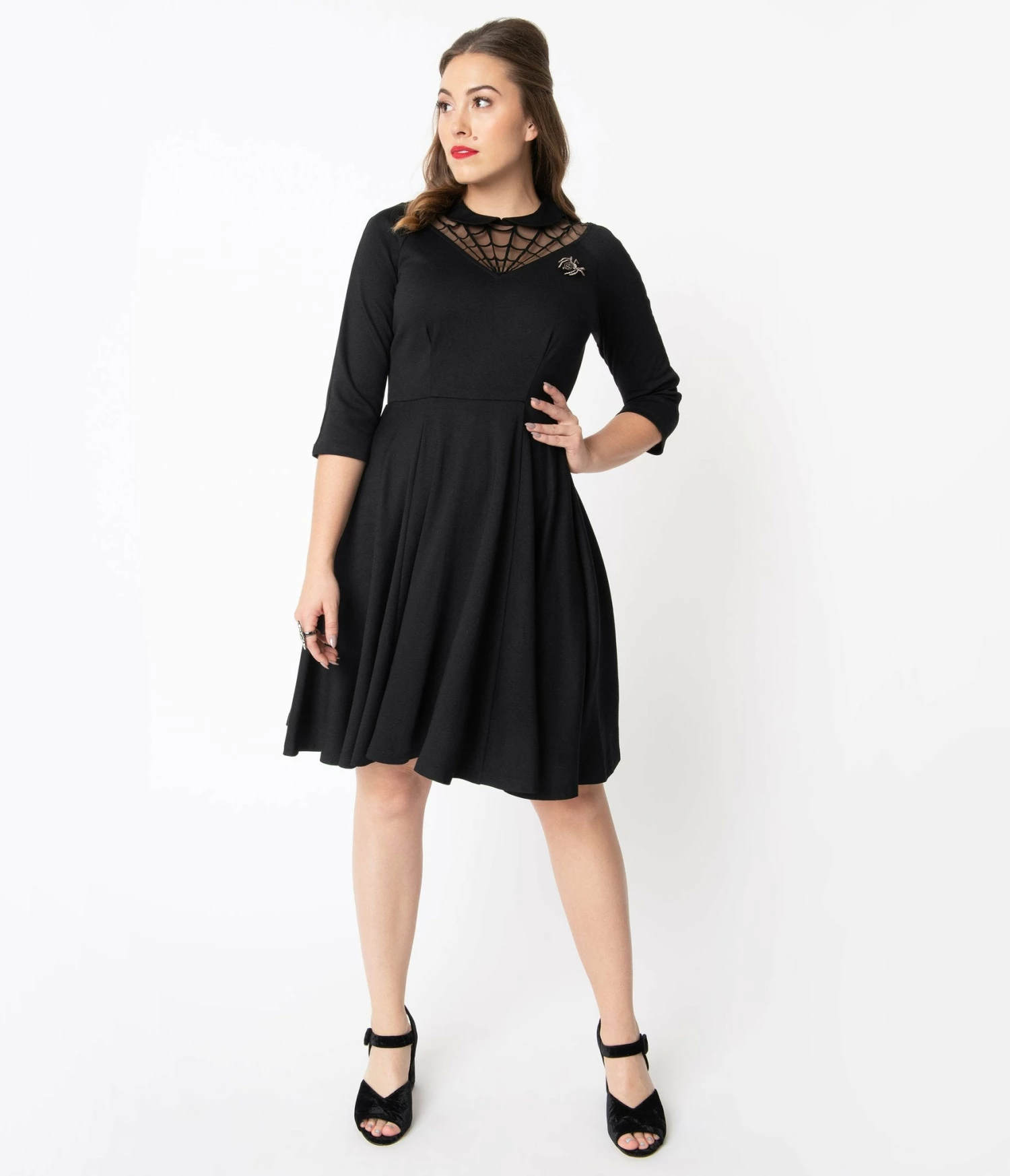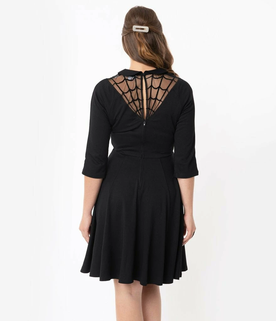 Revenge is beneath you, but accidents do happen, dames! A thrilling silhouette for midnight frights, the Endora Dress is a bewitching sight in a black stretch blend. Boasting a thrilling spiderweb V-neckline, centered by a sweet Peter Pan collar and secured in the back with a button keyhole, the flattering darted bodice is framed by three quarter length sleeves and sparkles with a spider brooch. The seamed waist is nipped by a back zipper while the sultry flare skirt dances just above the knees. For a little spell casting fun!