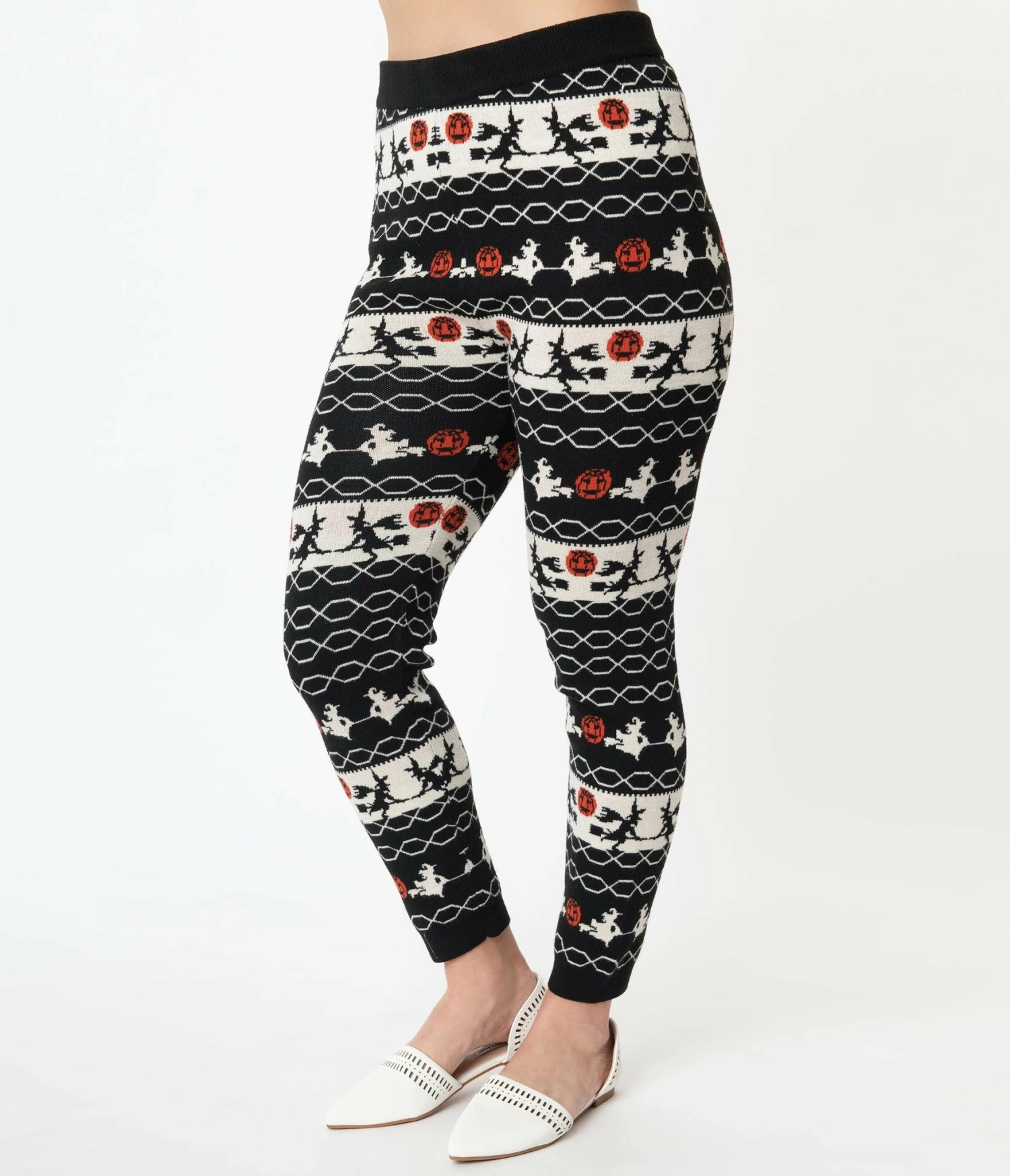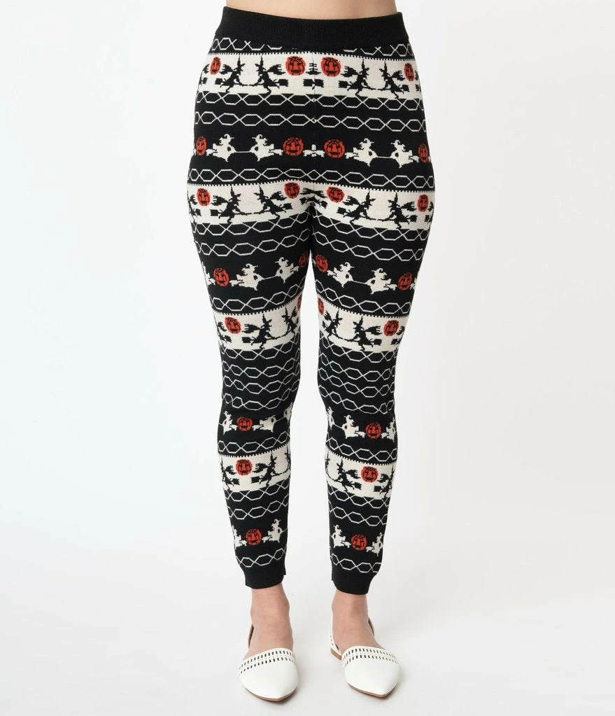 Your comfy game is strong, gals! Keep is cute and casual with the Sycamore Leggings from Unique Vintage. Crafted in a soft and thick knit blend and boasting a bewitching fair isle pattern of witches and jack-o-lanterns throughout a black backdrop. The elastic banded waist nips in your figure and drops into stay-in-place cuffs at the ankles!