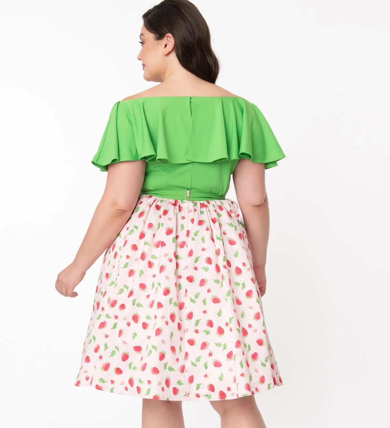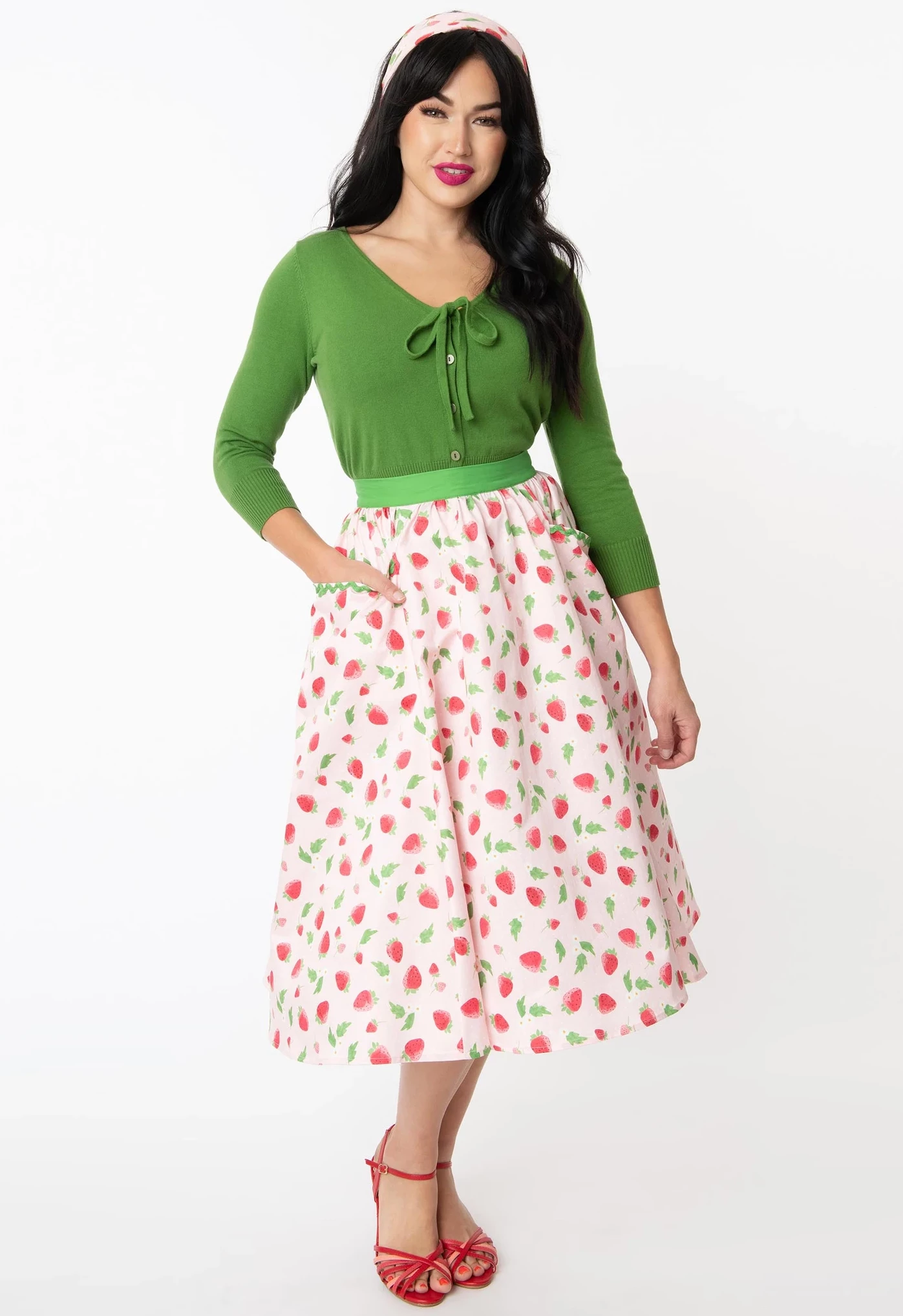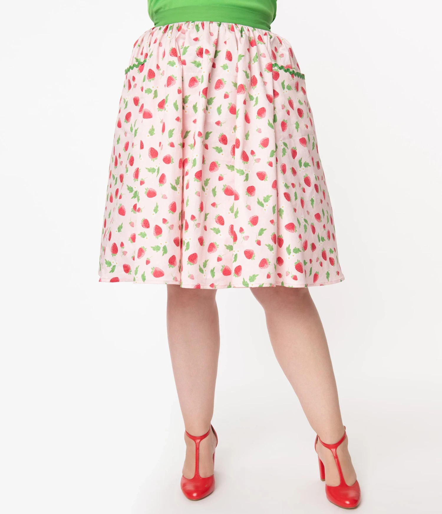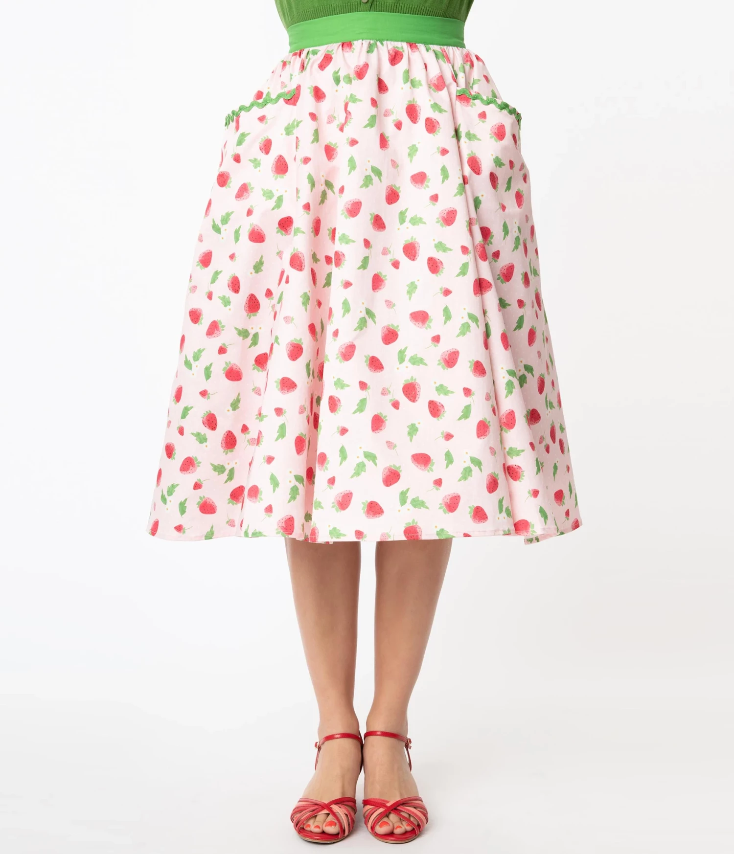 Show them what you want, dolls! This sweet swing skirt from Unique Vintage is crafted in a study and smooth woven fabric that gleams with strawberries and florals throughout the dotted light pink backdrop. The green banded waist is cinched with a back zipper while the sweeping form drops to the knees. Outfitted with open side pockets and embellished with green ric-rac, it’s a special treat!