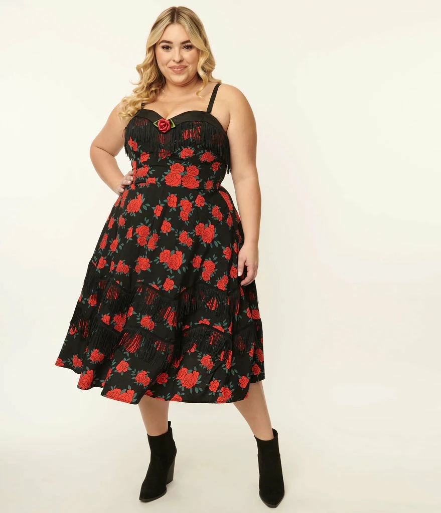 Crafted in a smooth woven black fabric with a print of red roses, and embellished with black fringe while the sweetheart bodice boasts a rose brooch adjustable and removable strap. Cinched with a back zipper and complete with a swing skirt.