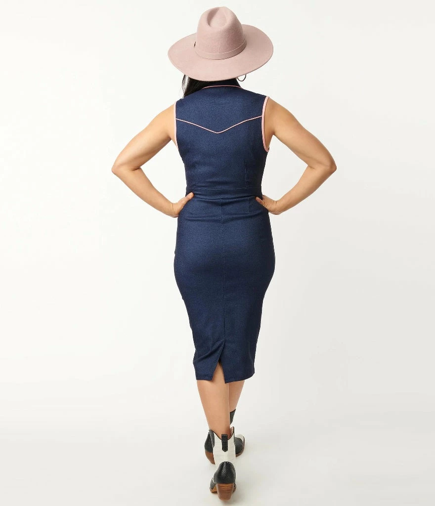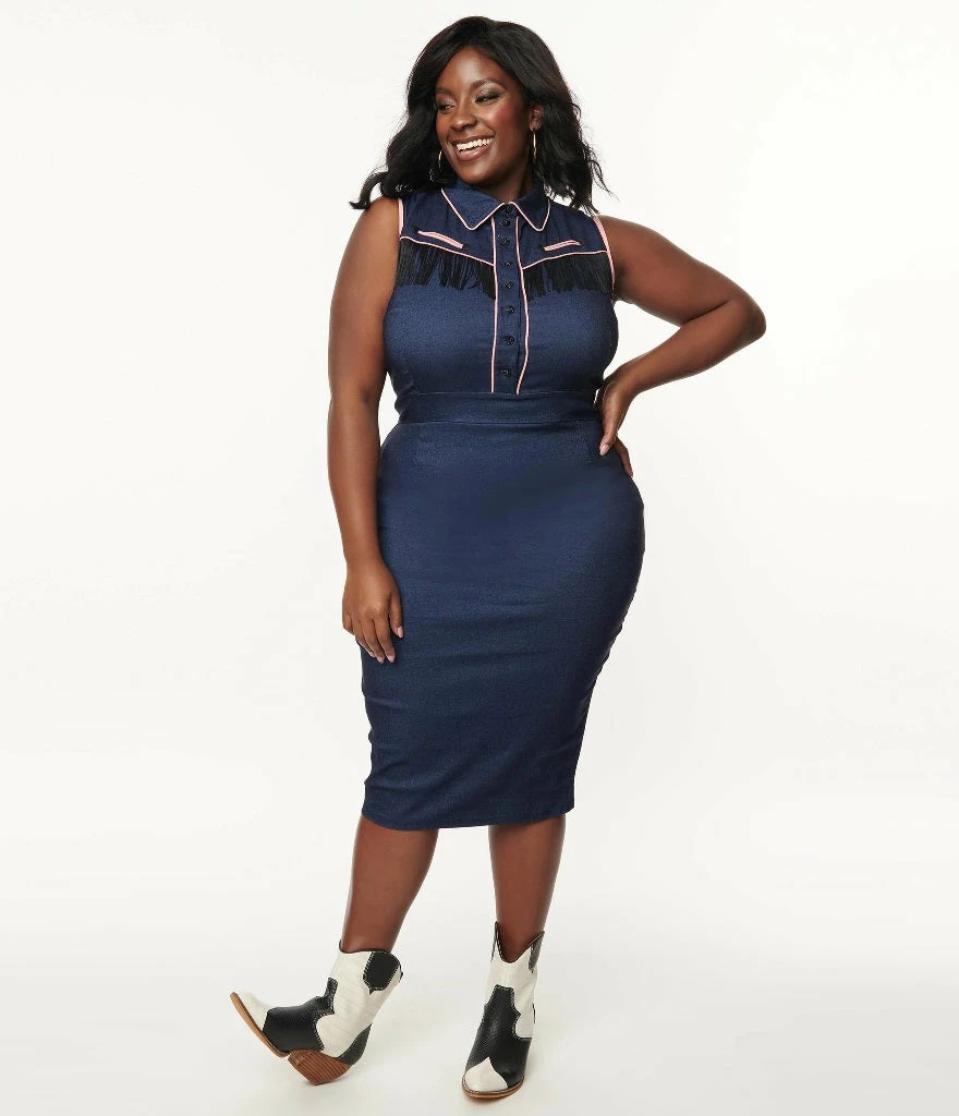 This western style wiggle is crafted in a marvelous denim blue stretch blend that hugs your feminine curves. The button up bodice dances with a sweet western yoke, complete with fringe and a classic collar, set in a sleeveless design. The seamed waist is cinched with a side zipper as the sultry pencil skirt drops to your knees, complete with a back vent!