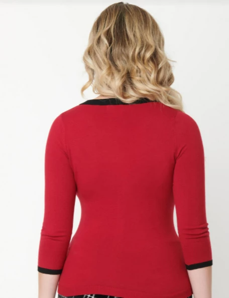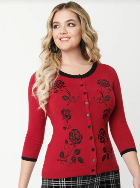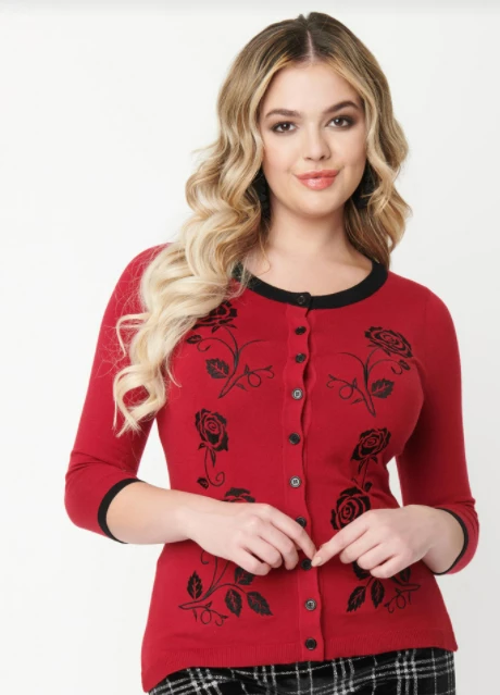 Unique Vintage Red/Rose Embroidery Three Quarter Sleeve Cardigan