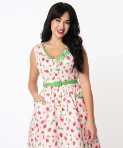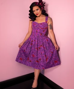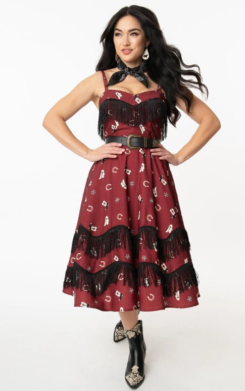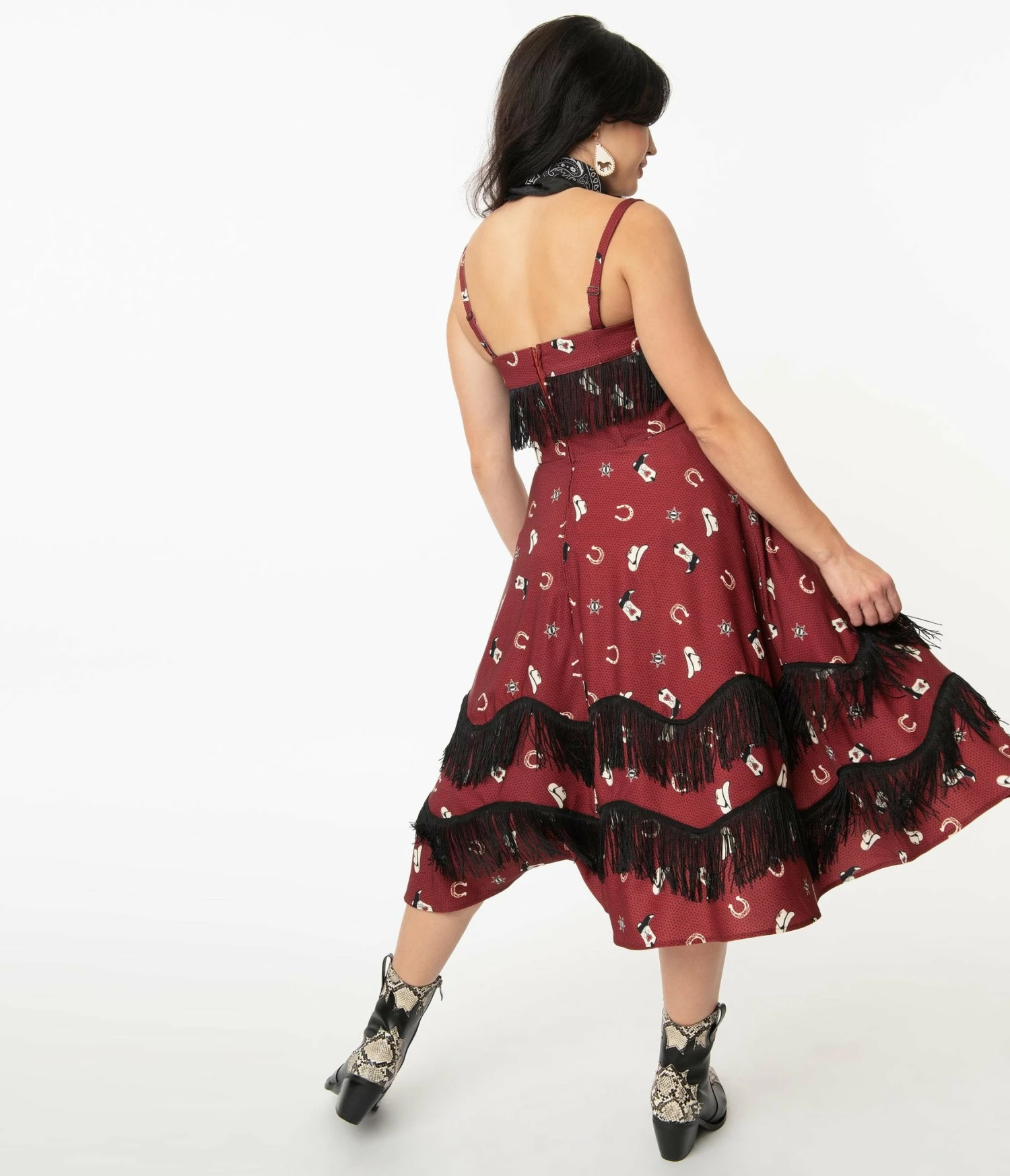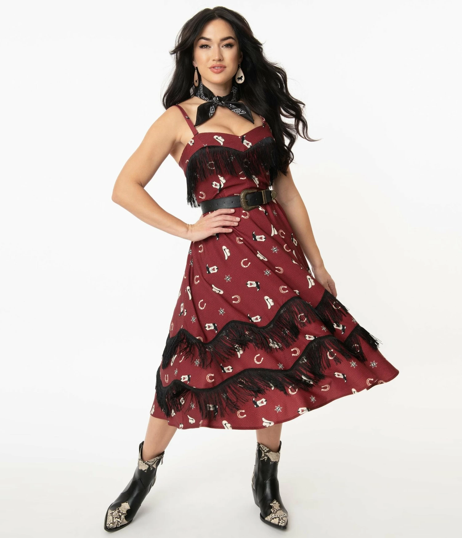 Saddle up, dolls! Click your spurs for this adorable plus size swing dress from Unique Vintage, crafted in a smooth woven burgundy fabric and dancing with the cowgirl iconography of boots, horseshoes, and hats.