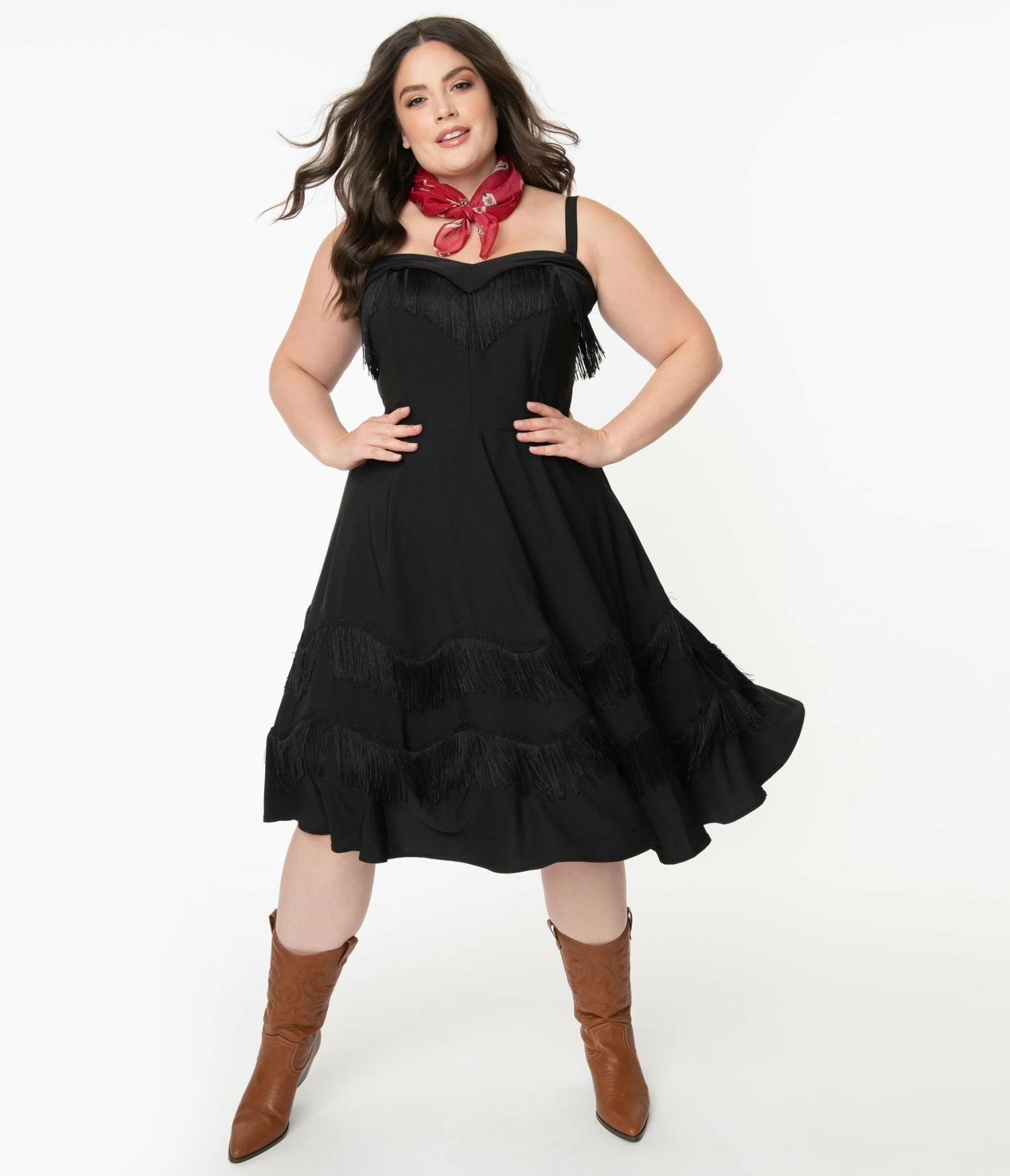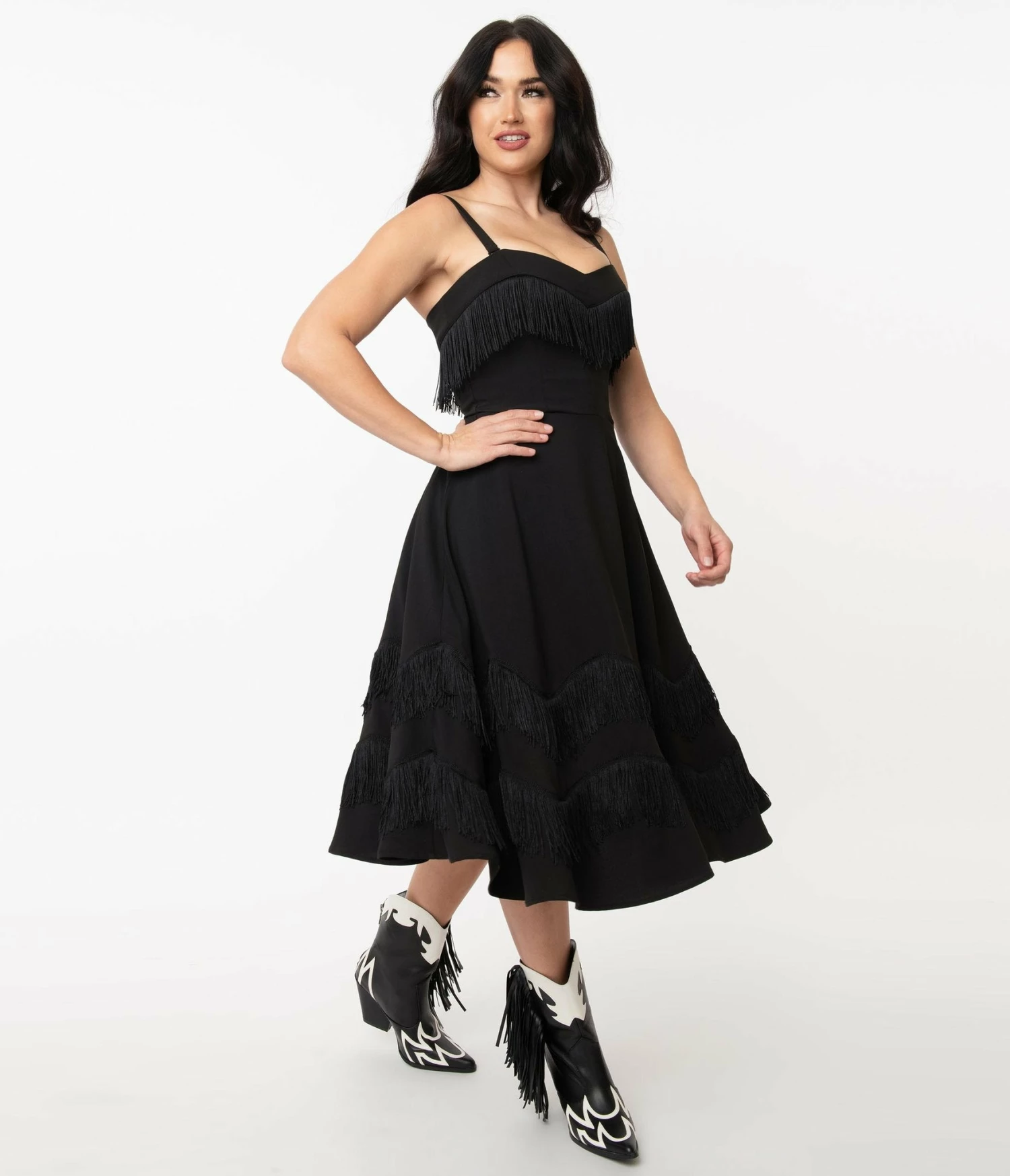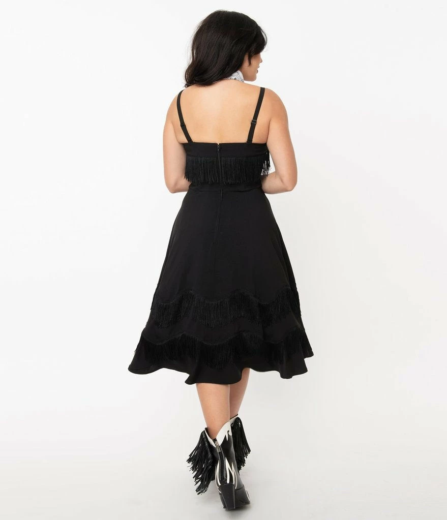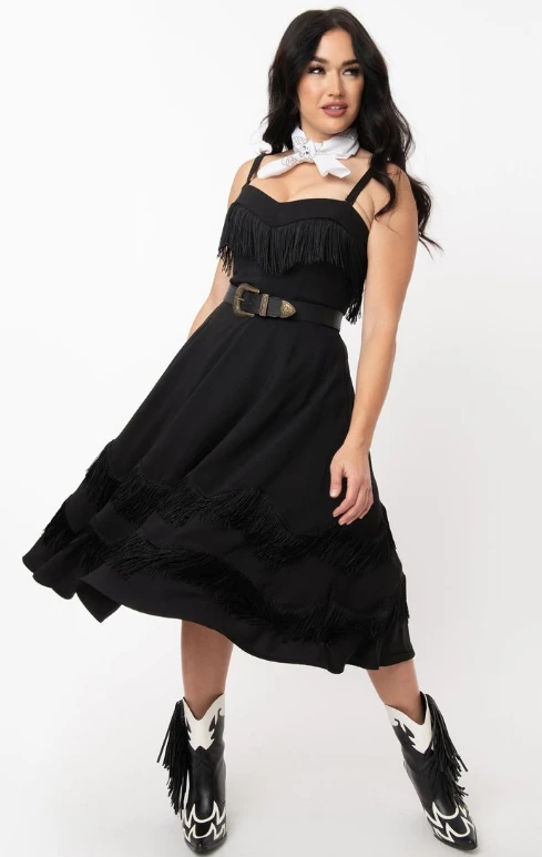 Saddle up, dolls! Click your spurs for this adorable swing dress from Unique Vintage, crafted in a smooth woven black fabric. The Girlie Dress is embellished with black fringe while the sweetheart bodice boasts adjustable and removable straps for versatile styling. Cinched with a back zipper and complete with a fantastic swing skirt, this dame is ready for the rodeo!