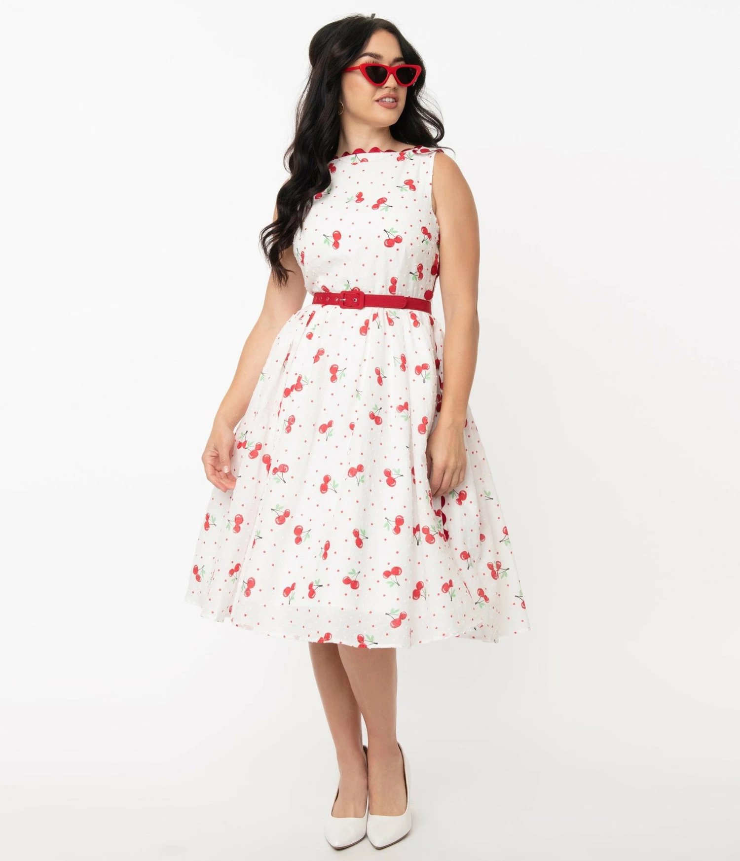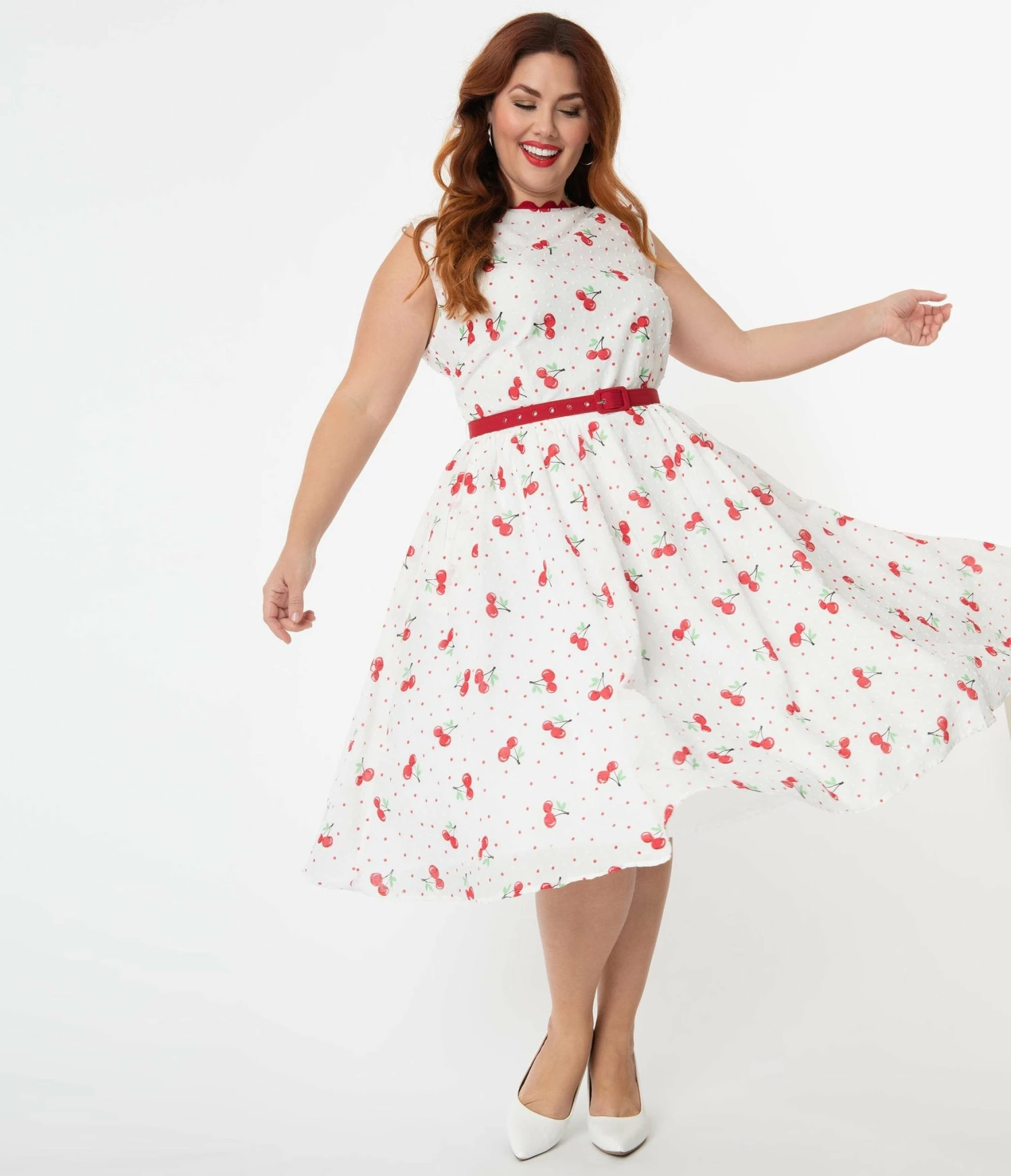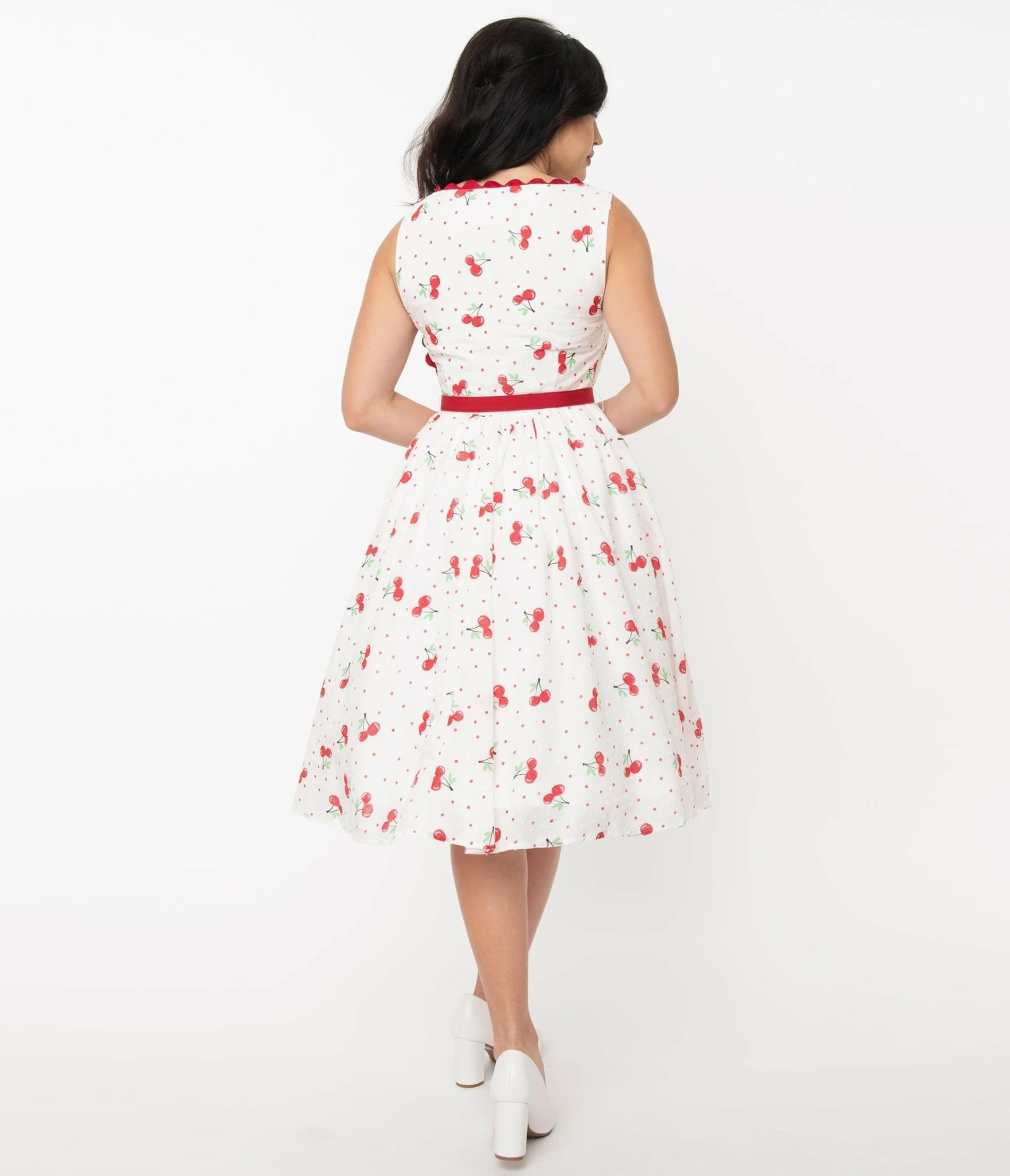 Pin-up prime, dears! This rockabilly delight from Unique Vintage is crafted in a fabulous clip dot white fabric that dazzles with a red cherry and polka dot pattern throughout. The Livvie Dress features a sleeveless bodice that’s nipped in with a unique button up side and topped by a modest neckline, secured with a functional button tab on the shoulder. The seamed waist is cinched with a charming belt and tops a gathered swing skirt, complete with one side pocket, while the full lining keeps you comfortable!