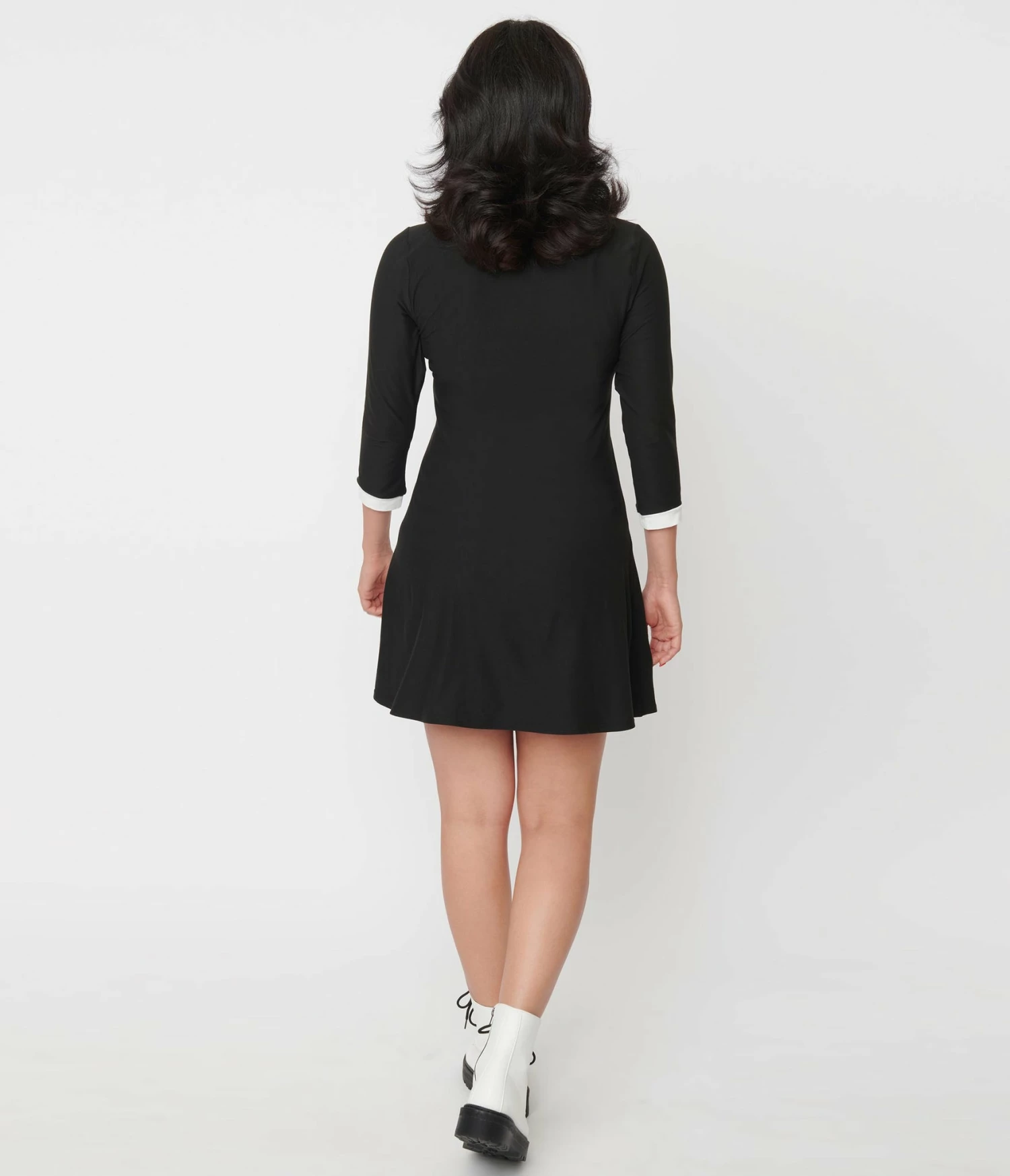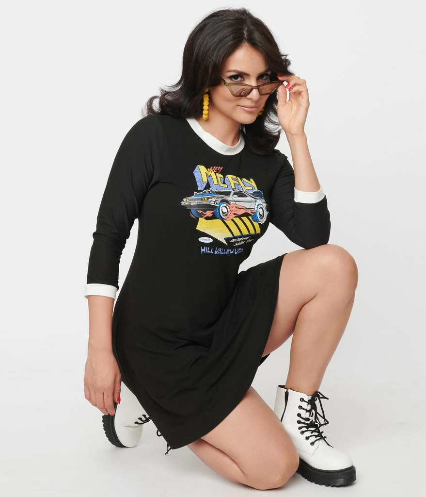 Well looky what we have here! A playful piece from Unique Vintage in collaboration with the iconic Universal film, Back To The Future, this casual flare is crafted in a silky black jersey stretch and boasts a stunning graphic print of the DeLorean Time Machine on the front. The modest crew neckline is set in solid white while the three-quarter length sleeves drop into a matching cuff. The tapered silhouette is complete with a flirtatious flare skirt that dances high above the knees!