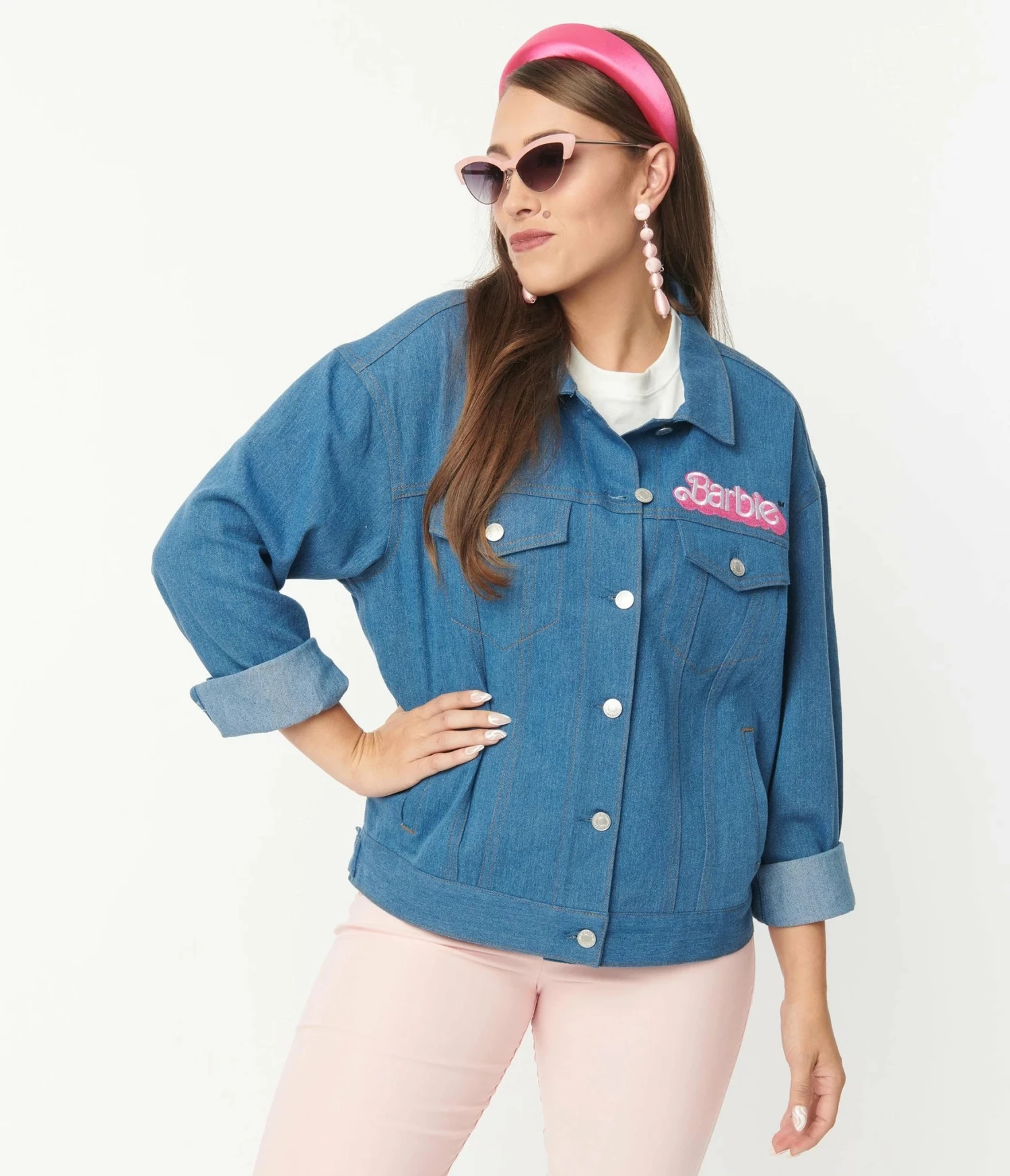 Spin up some retro tunes with this fabulous oversized jean jacket, fresh from Unique Vintage in sweet collaboration with Mattel’s Barbie. The Kerstie Jacket is crafted in a classic blue denim with contrast seaming and boasting a pink embroidered patch of Barbie’s name on the front and back. The button up front leads to a classic collar while the long sleeves drop into button cuffs and was it button tabs lend a dash of form. Two chest pockets are secured with buttons while hidden side pockets provide plenty of space for your tools!