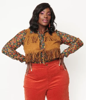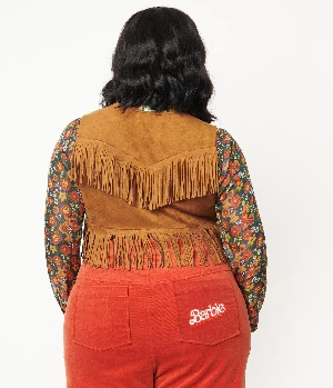 The sweet and soft Gaucho Gear Vest from Unique Vintage is a charming life-sized reproduction of Barbie’s vintage Gaucho Gear Set, originally released in 1971. Crafted in a marvelously soft faux brown suede, the shortened style dances with long fringe on the hem and along the yoke. Outfitted with long self tie cords that drop into a dainty gold bead!