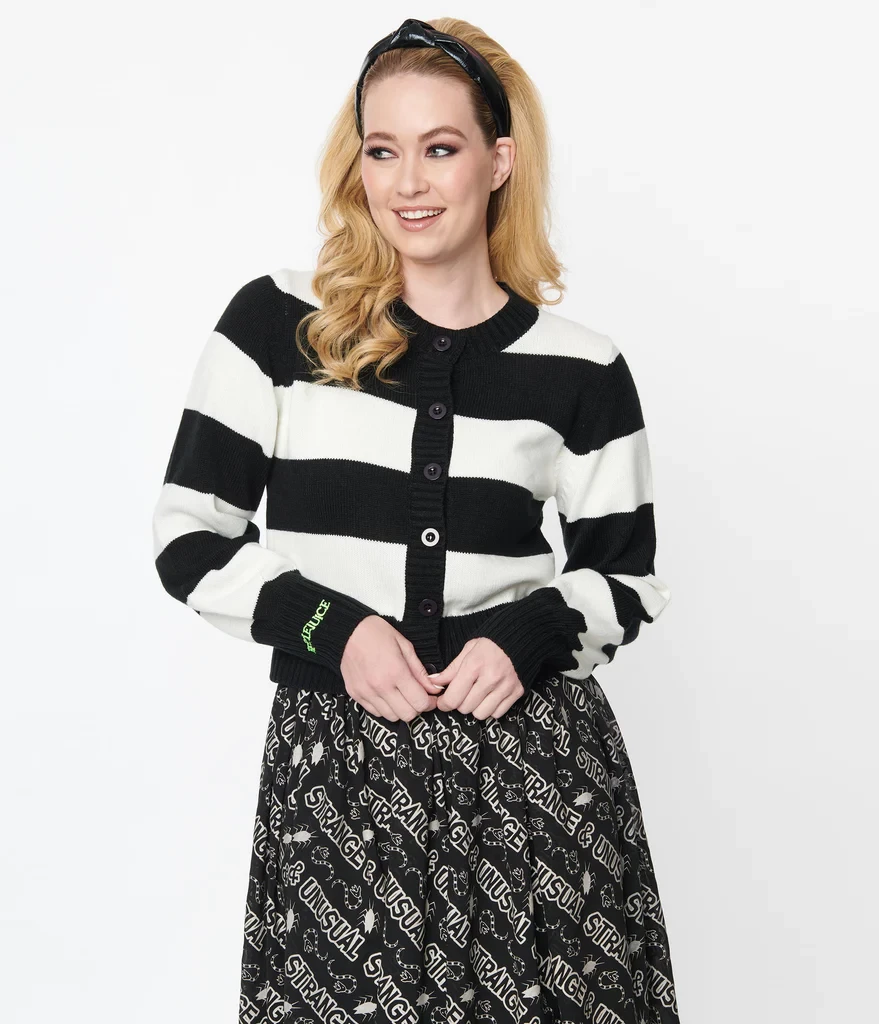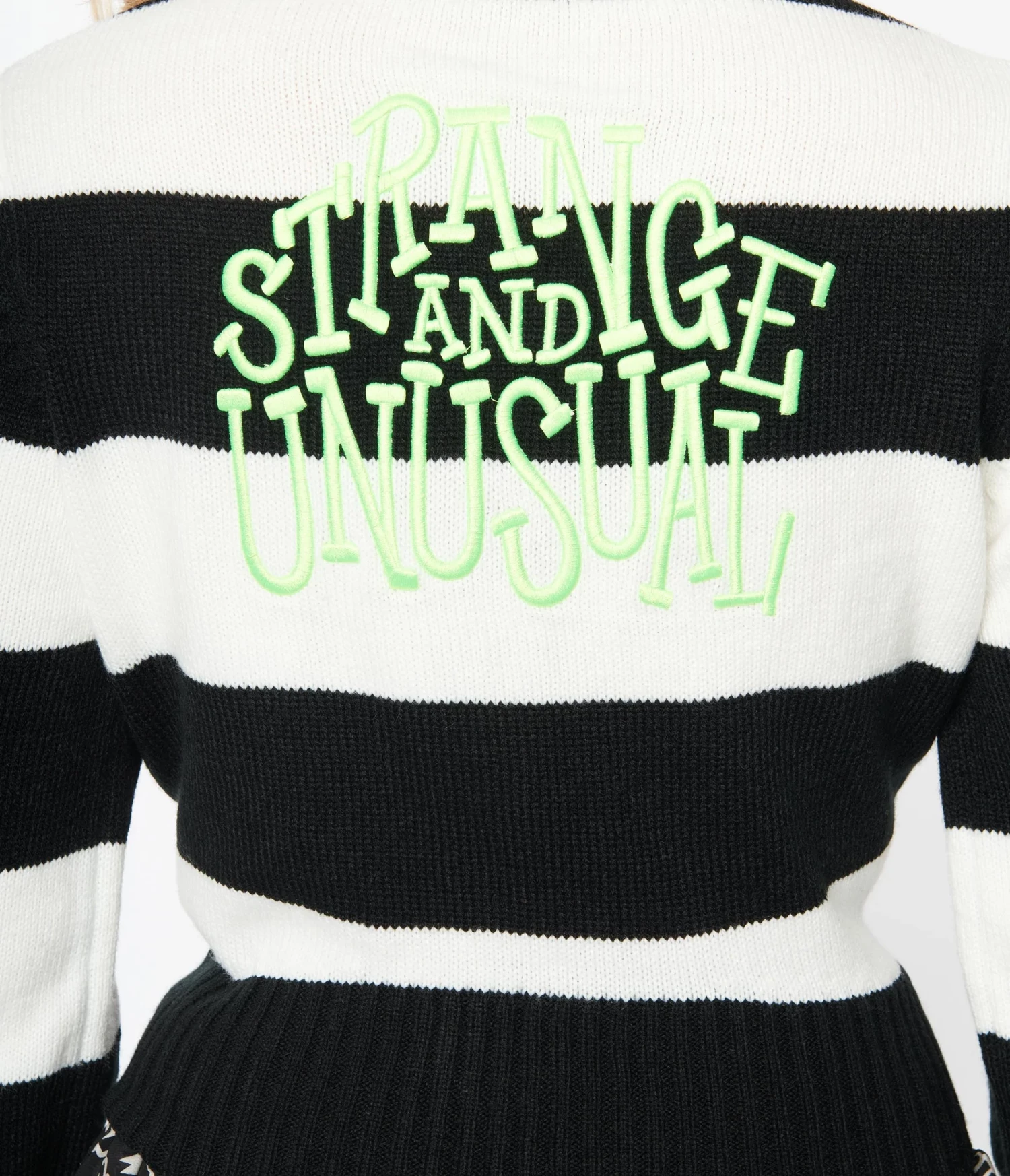 Crafted in a soft sweater knit with black and white stripes. The long sleeve cardigan boasts the words ‘Strange and Unusual’ embroidered in green on the back.