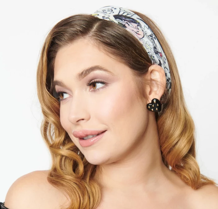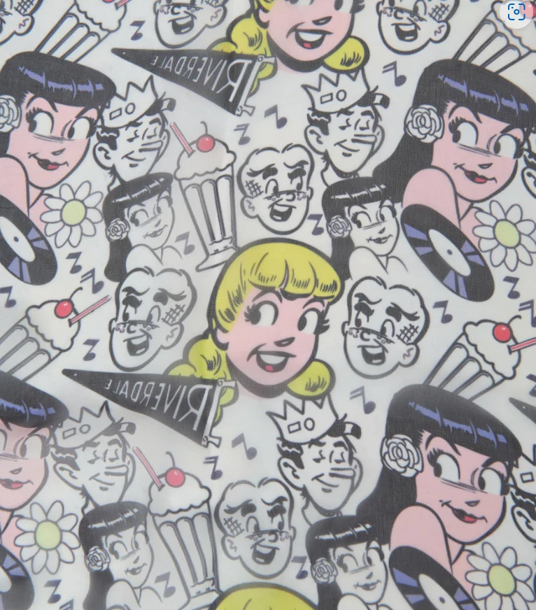 This adorable hair scarf, in collaboration with Betty and Veronica, is crafted in a sheer chiffon-style fabric that dances with an all over print of Betty, Veronica, Archie, Jughead, milkshakes, records, and Riverdale banners throughout the sheer mesh.