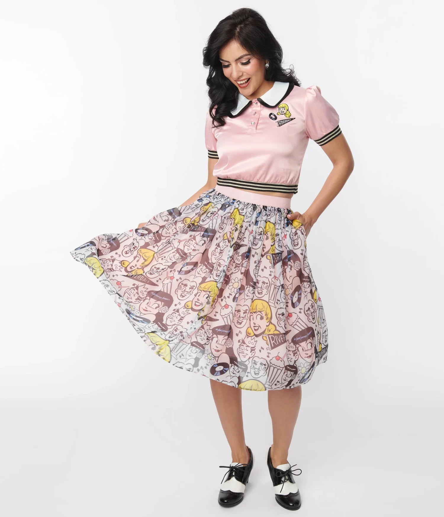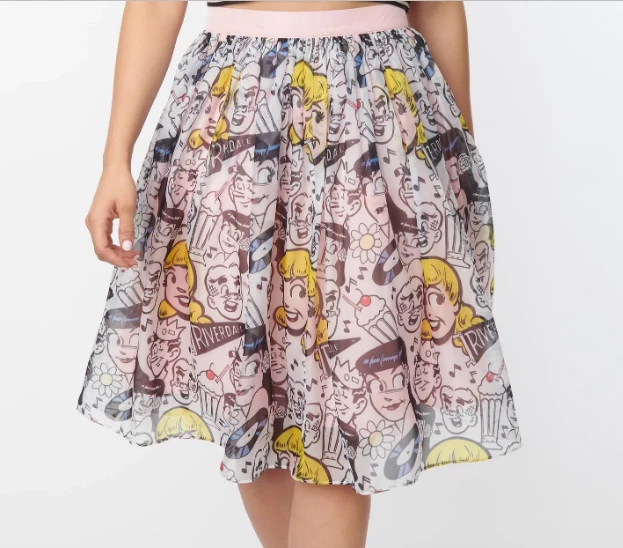 This playful mid-length skirt is a fabulous collaboration with Betty & Veronica, dancing with an all over print of Betty, Veronica, Archie, Jughead, milkshakes, records, and Riverdale banners throughout the light pink sheer mesh. Outfitted with a back zipper, lining, and side pockets.