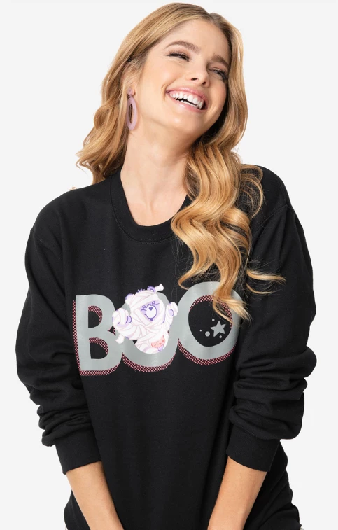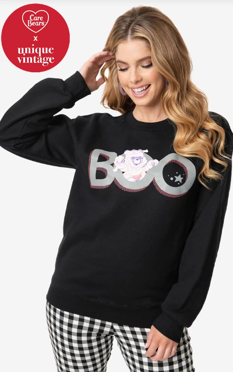 The cutest little monster, dears! A hair-raising piece from Unique Vintage, this spooky sweatshirt is a charming collaboration with Care Bears, featuring Share Bear dressed up as a mummy and yelling ‘BOO’! The classic crew neckline and comfortable long sleeves make this the perfect treat!