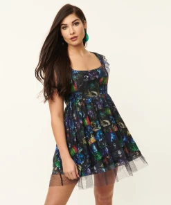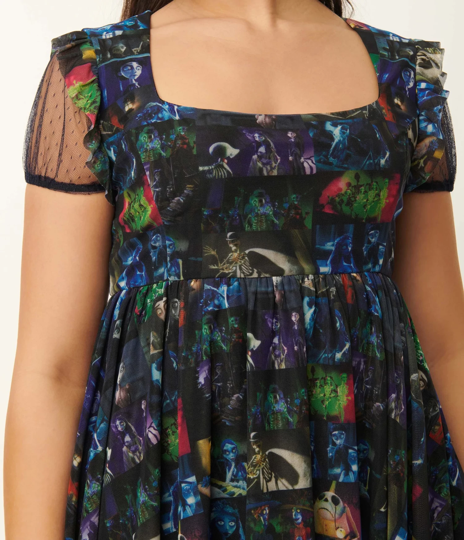 This chilling babydoll dress, in collaboration with the Corpse Bride, is crafted in a woven black mesh that features a brilliant collage of scenes from the Corpse Bride movie. Complete with a back zipper and side pockets.