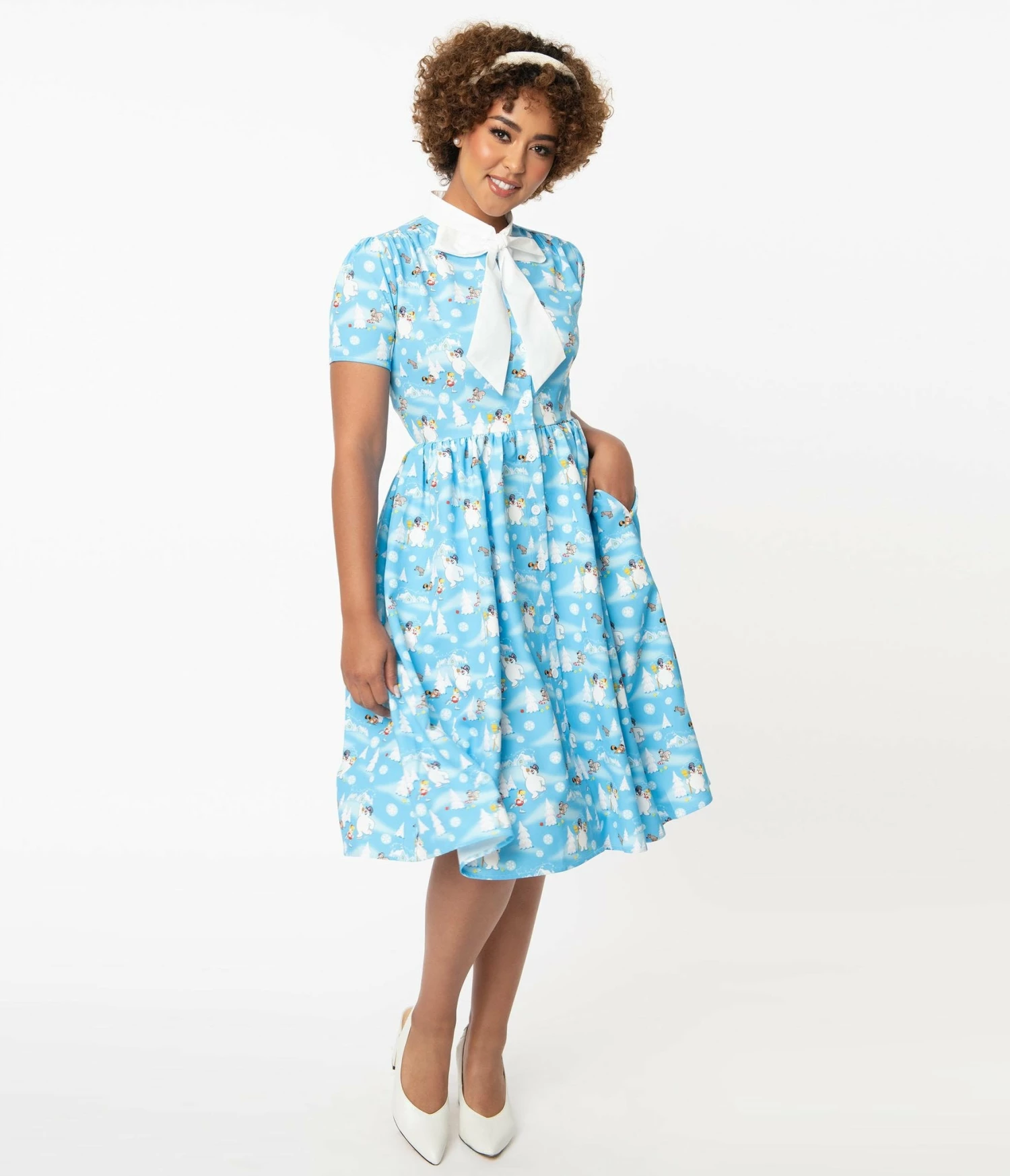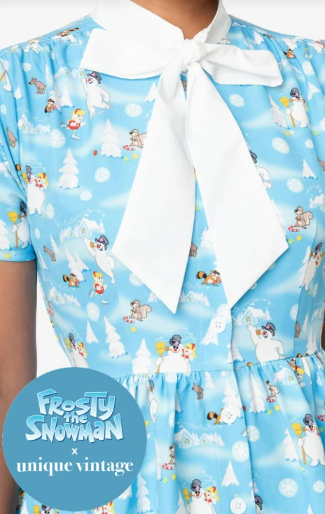 Bring some magic to your day, darling! A winter fairytale in collaboration with Frosty the Snowman, featuring a chic blue backdrop with an adorable print of Frosty playing in the snow, this adorable mid-century piece from Unique Vintage is a captivating silhouette in sturdy woven fabric. The marvelous button-up design is highlighted with sweet short sleeves, darted bodice, gathered yoke, and a fantastic self-tie neck scarf in solid white to center your ensemble. Seamed at the waist, the gathered circle skirt drops to a straight hemline at the knees while hidden side pockets keep your enchanted treasures close at hand!