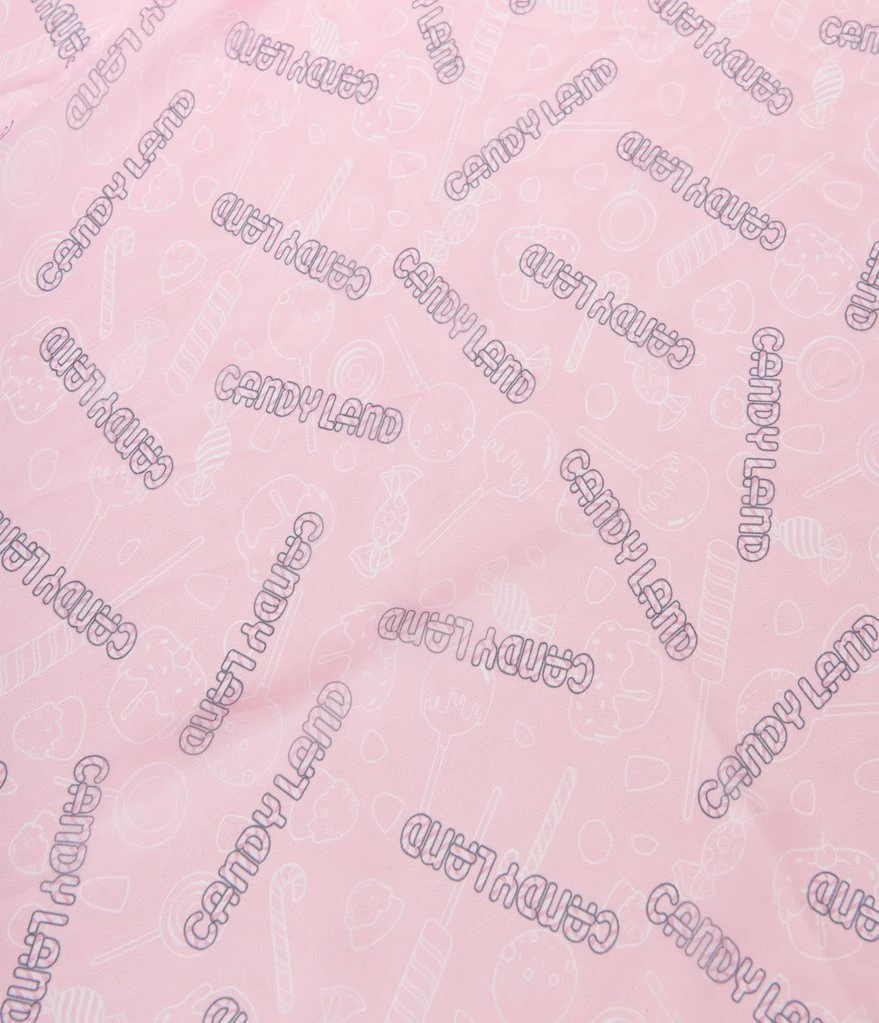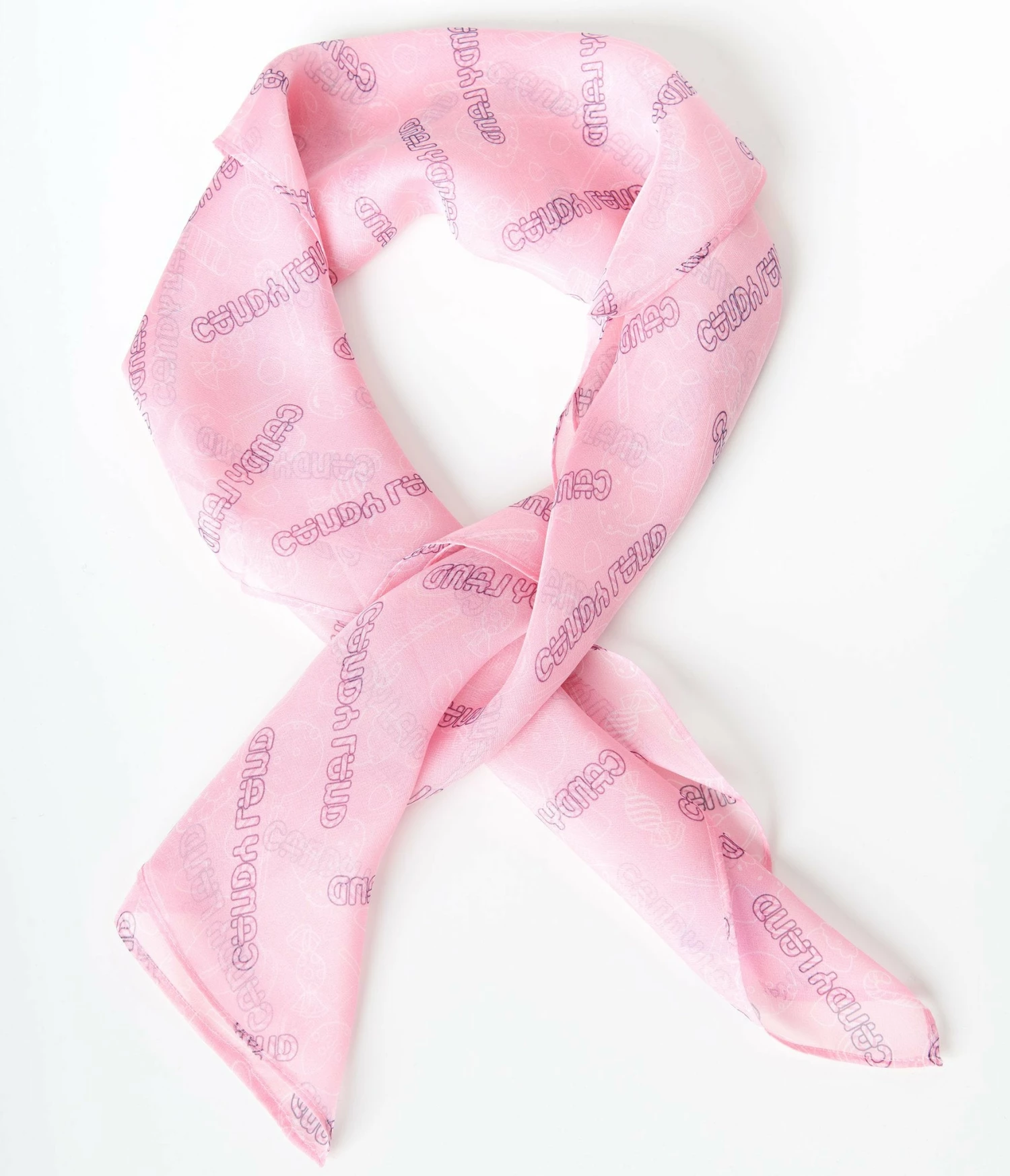Set off on your sweet adventure with this adorable piece fresh from Unique Vintage in collaboration with Hasbro’s delectable Candyland game! Crafted in a soft chiffon, a marvelous all over print features outlined tasty treats and the infamous Candyland logo throughout a pink backdrop. This hair scarf is perfect for tying up and around your divine ‘do – any excuse for a little sky-high hair help!