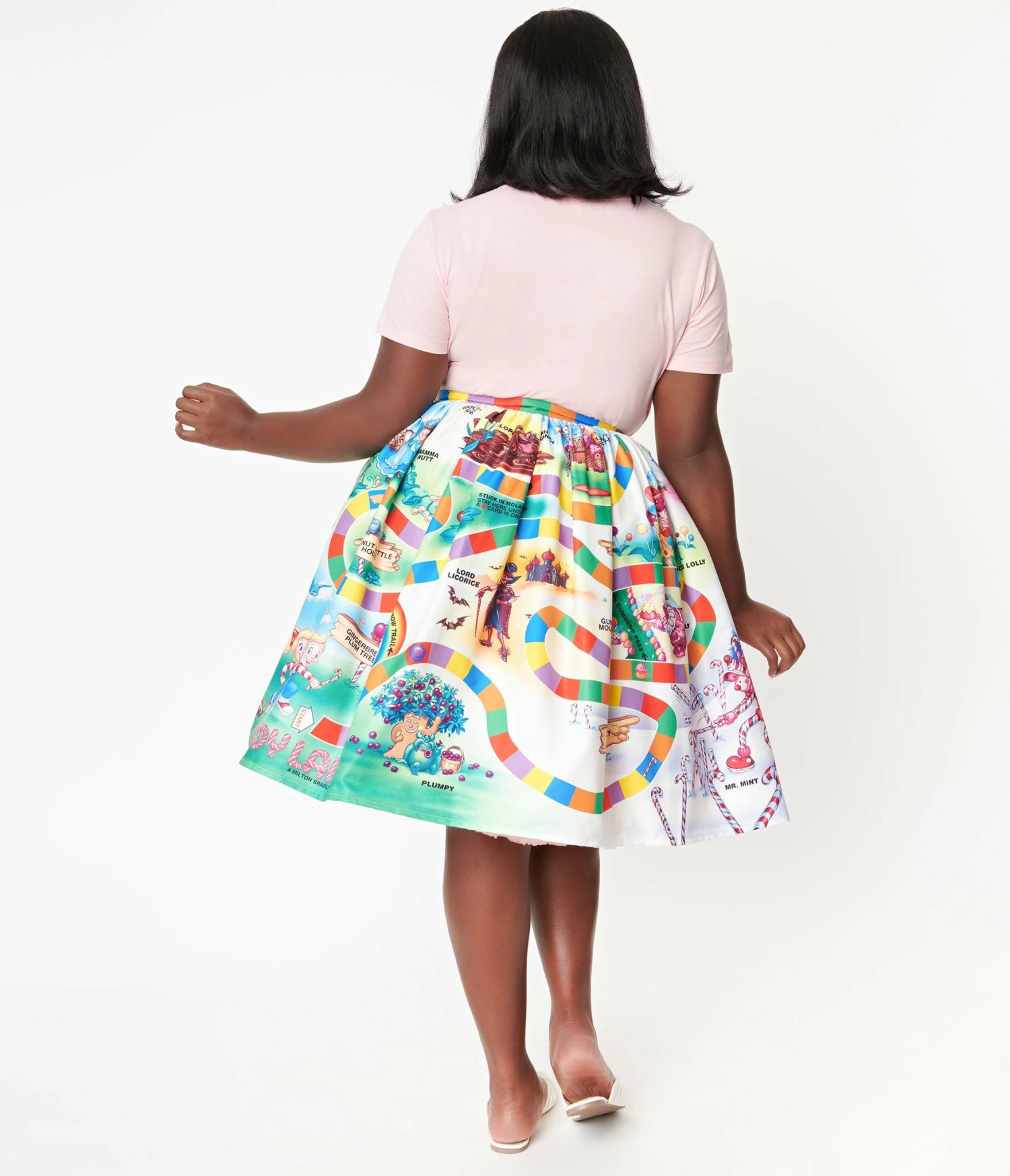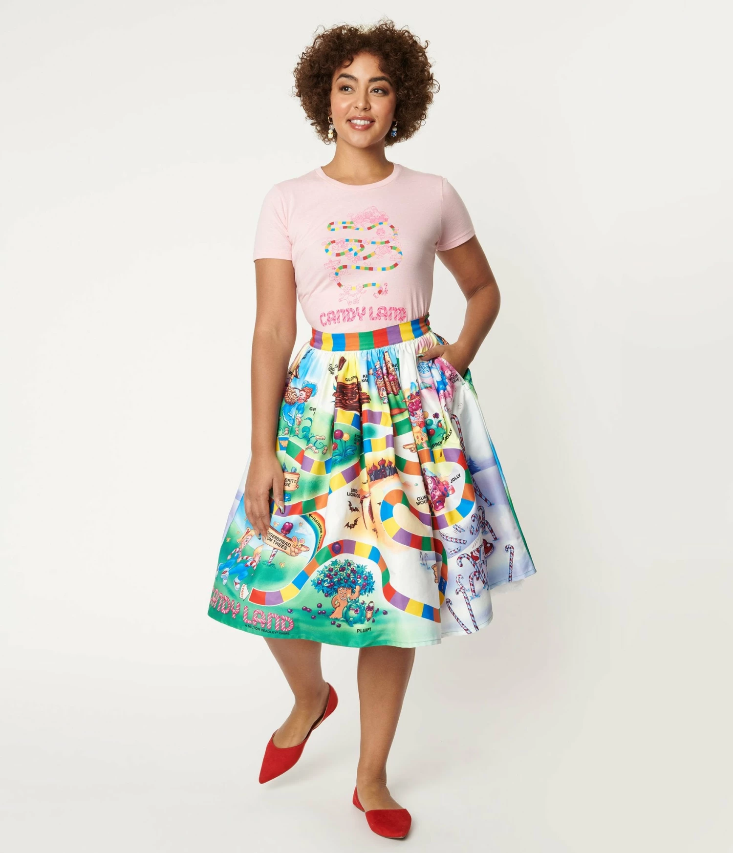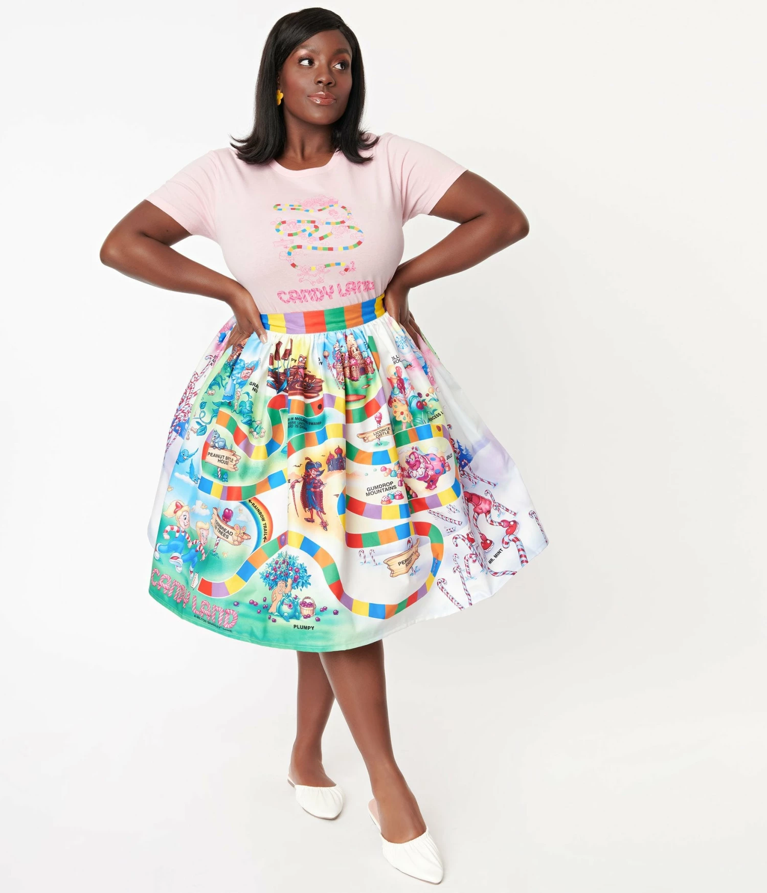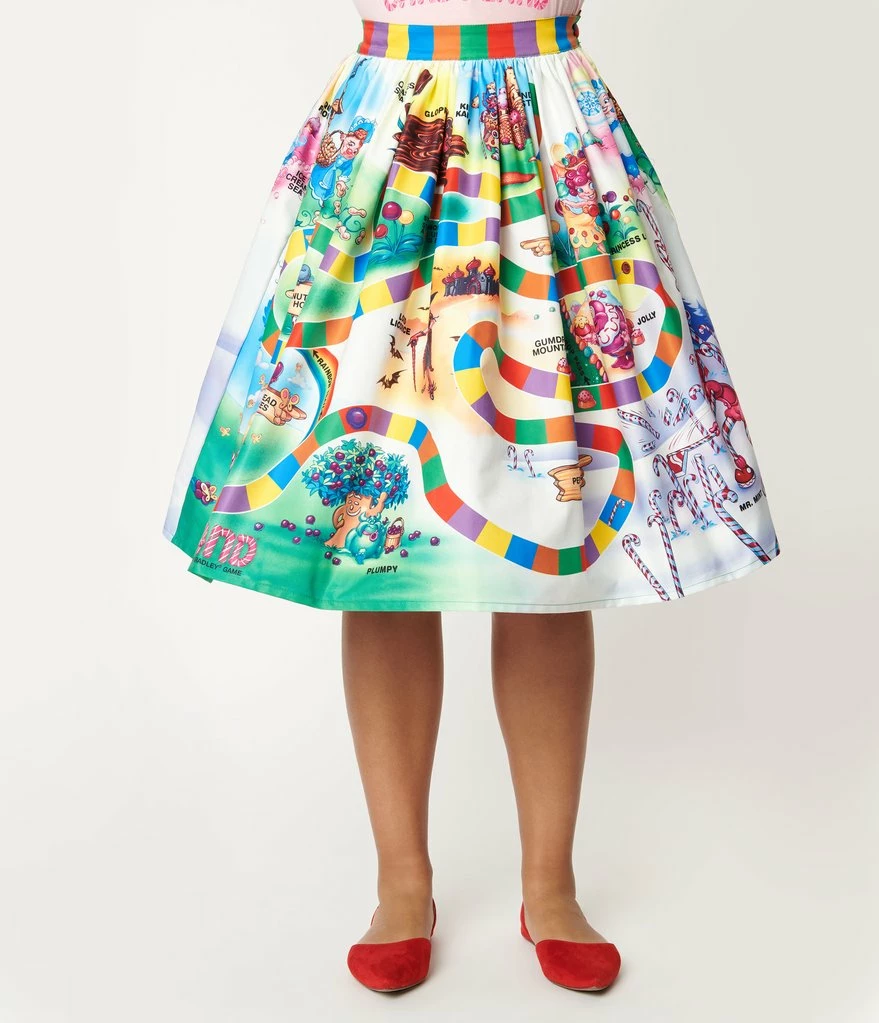 Start down the road of sweet adventures in this delightful gathered swing skirt from Unique Vintage in collaboration with Hasbro’s Candyland. Crafted in smooth woven blend, this adorable separate boasts a beautiful print from the classic Candyland Board Game. Designed with a banded high waist, complete with side zipper and button to nip in your figure, the gathered A-line silhouette is outfitted with hidden side pockets to keep your game tokens close at hand!
