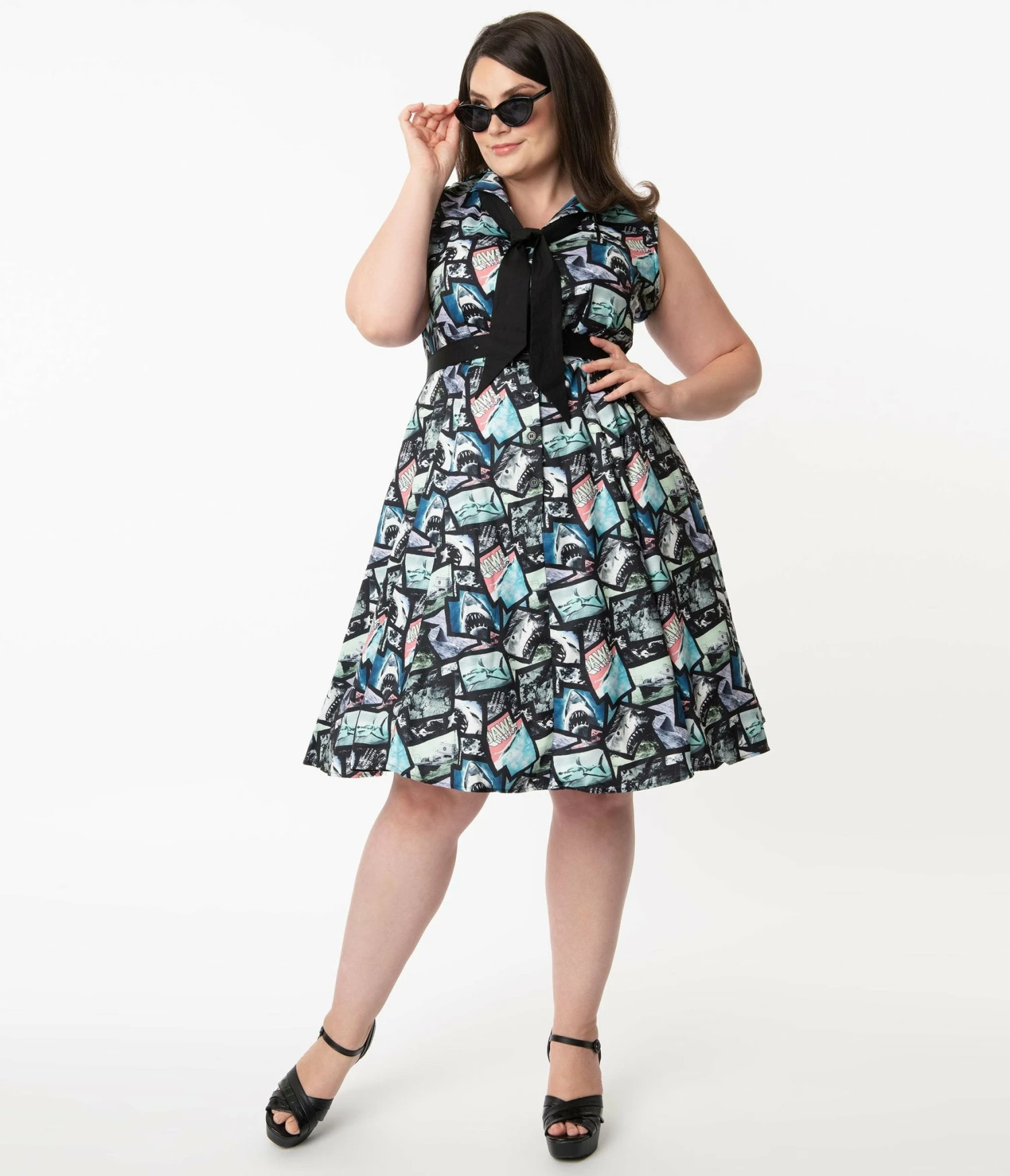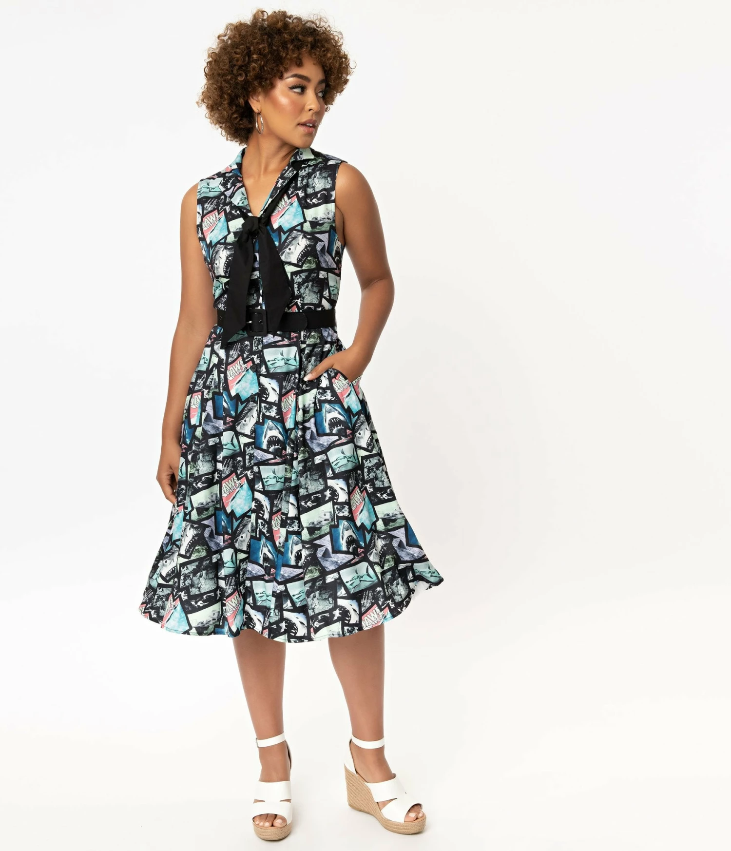 Get them screaming, dames! A fabulous mid-century frock from Unique Vintage, the Gigi Shirtdress is a thrilling collaboration featuring clips from the infamous Universal movie, Jaws. Crafted in a lightweight woven blend, the partial button up front leads to a classic notched lapel, highlighted with a removable neck tie and framed by a sultry sleeveless design. The darted bodice and seamed waist are cinched with a darling belt as the charming swing skirt drops the knees, complete with side pockets for modern function. It’s a blockbuster!