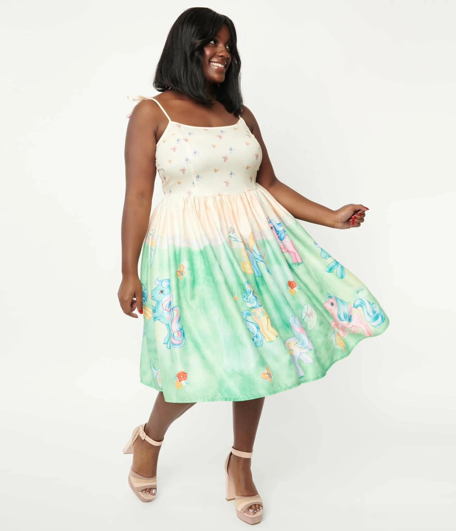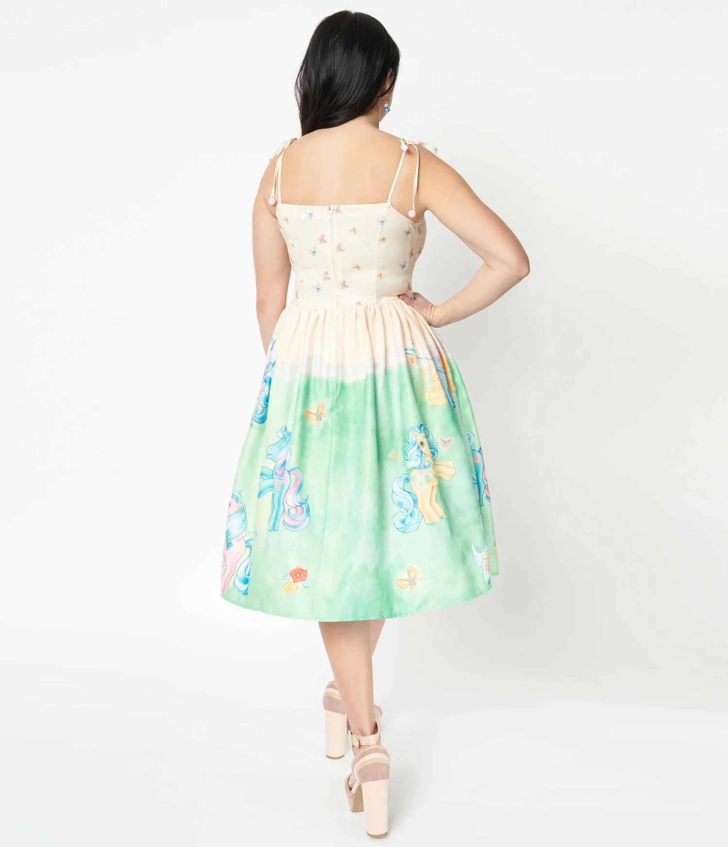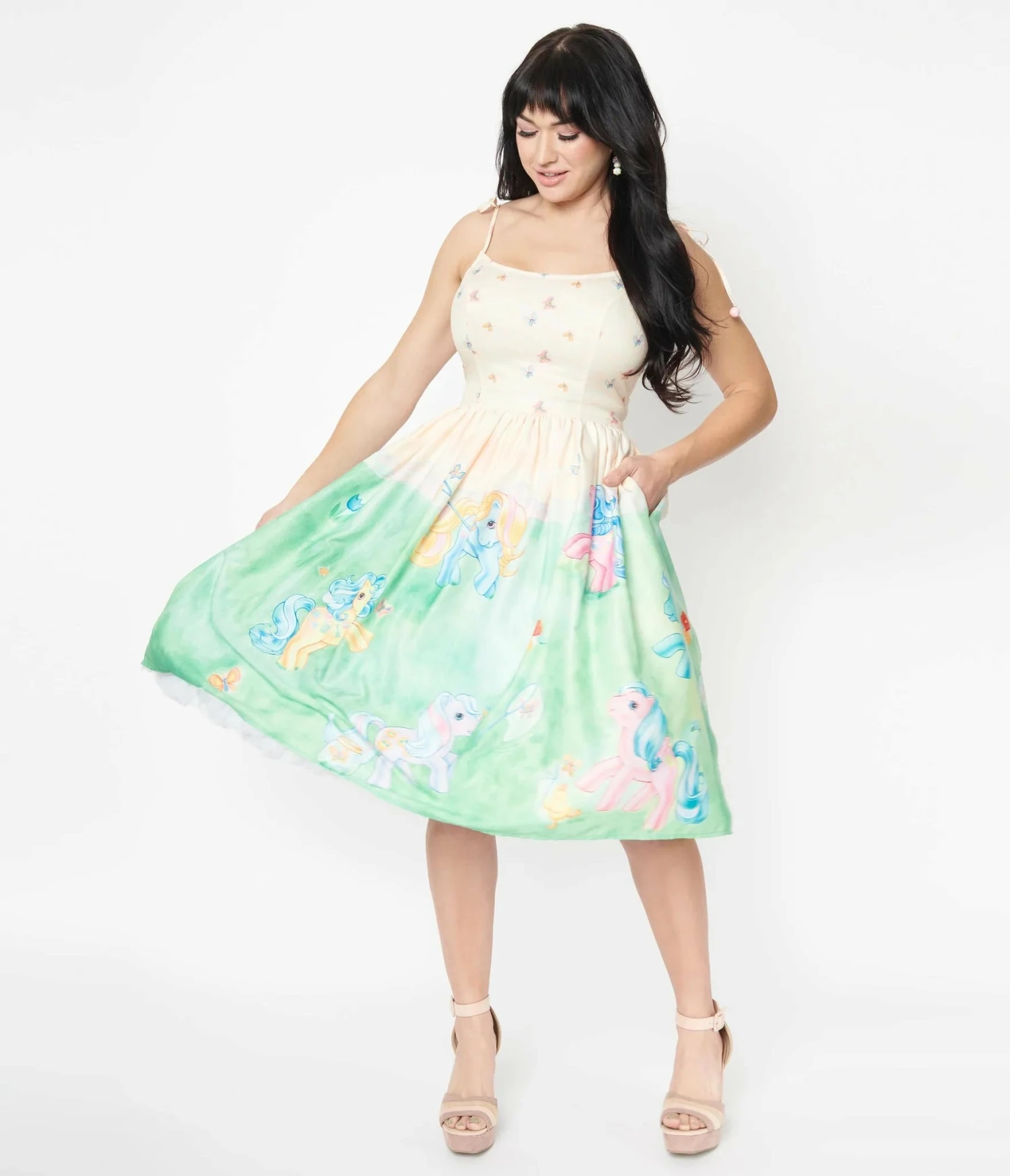 An adorably retro piece from Unique Vintage in collaboration with My Little Pony. The Bobbie dress boasts a yellow and green ombre with a sweet print of the ponies catching butterflies. This darling 1950s design boasts a princess seamed bodice, secured by adjustable spaghetti straps with beaded charms that provide a fabulous fit to your feminine form. The seamed waist centers and cinches your figure for flattering shape while the dramatic swing skirt cascades to the knees, complete with side pockets for fantastic function. Outfitted with a back zipper, for frolicking fun!