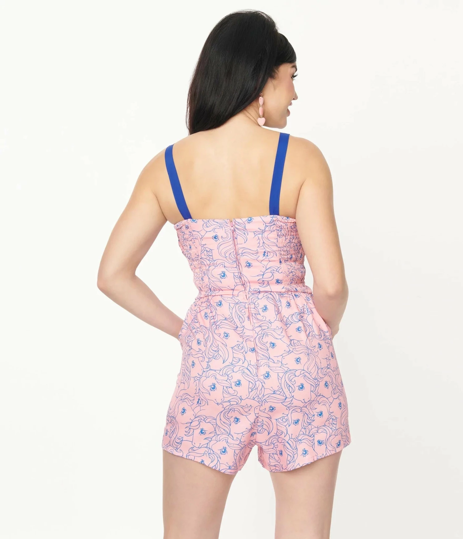 Frolic away in this sweet romper from Unique Vintage in collaboration with My Little Pony, crafted in a fabulous lightweight woven fabric that dazzles in a bright blue all over pony print throughout the pink backdrop. The sweetheart bodice is secured with button adjustable straps while side smocked panels provide a flattering fit. The gathered overlay is centered by a contrasting blue bow as a seamed waist is cinched with a back zipper. Outfitted with sultry shorts and complete with side pockets, make it your day!