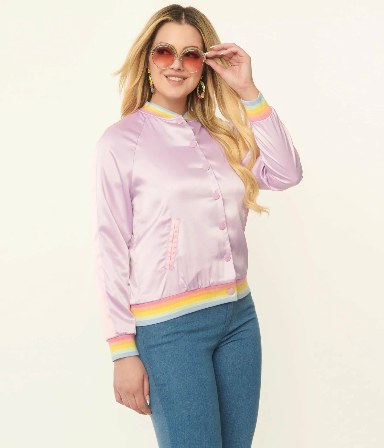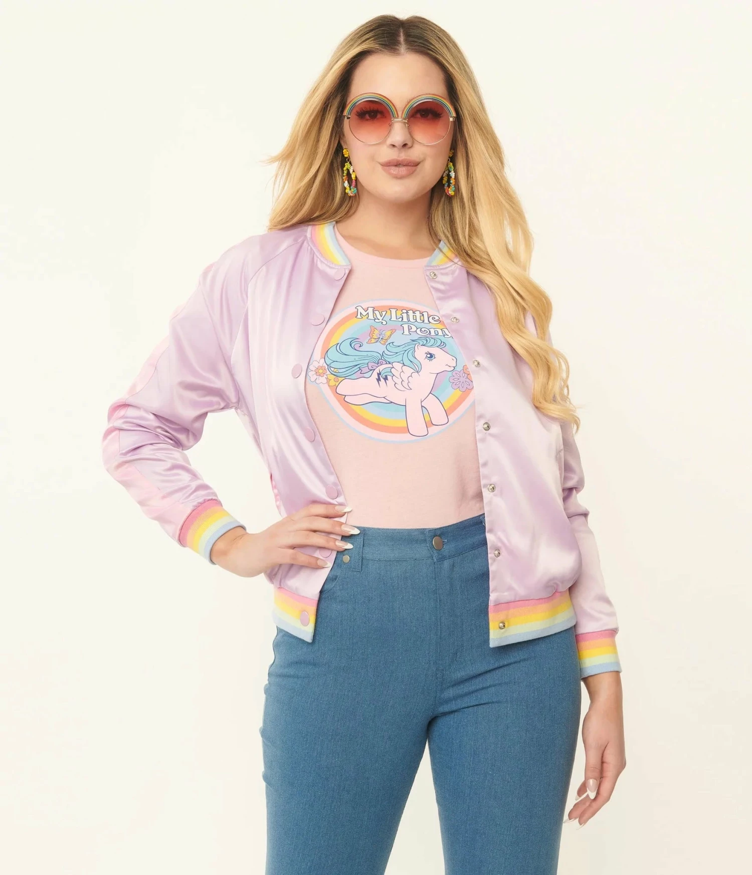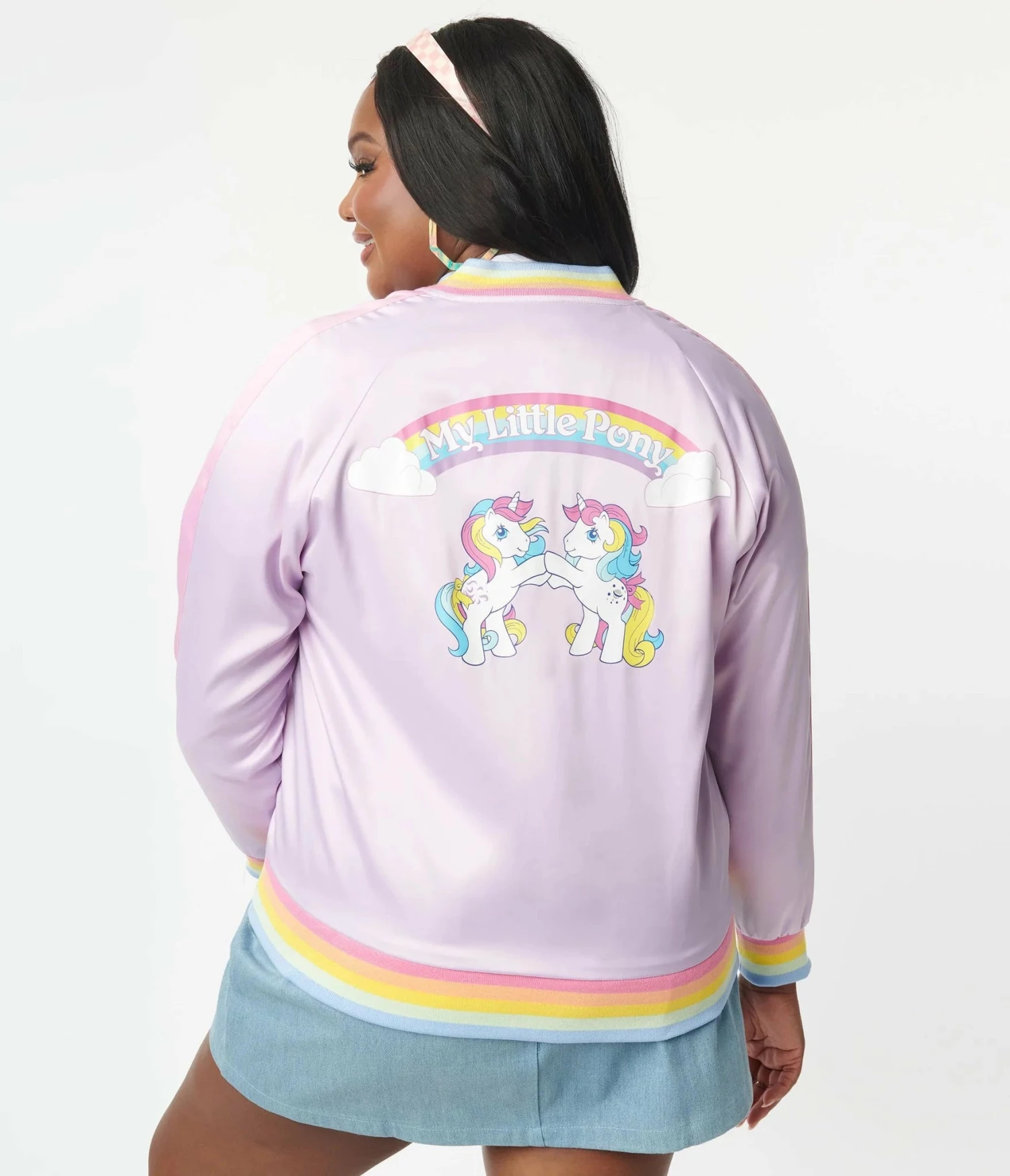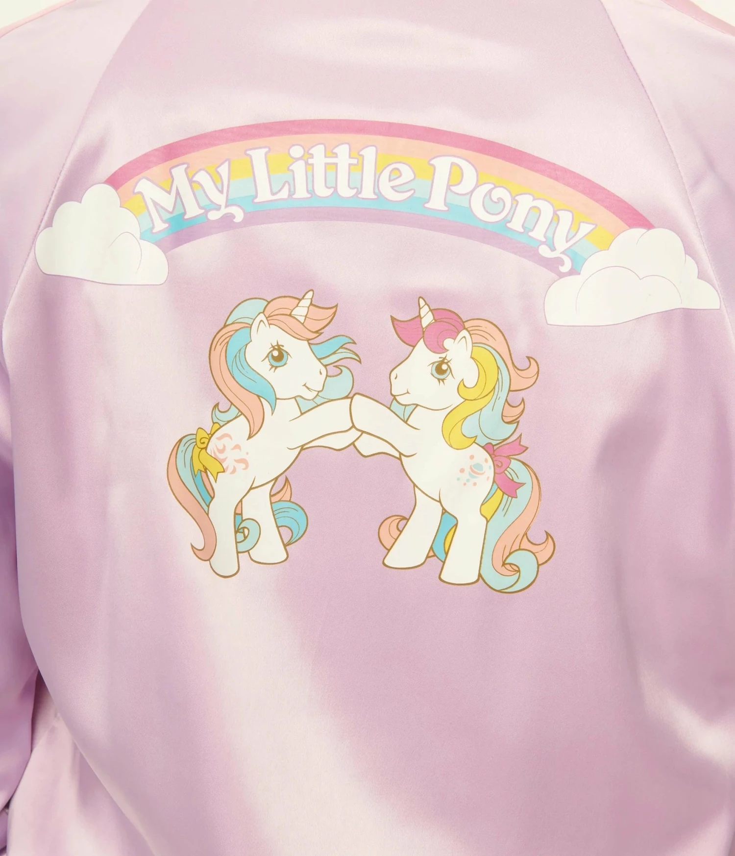 This adorable bomber style jacket is crafted in a beautiful light purple satin-like fabric. Outfitted with side pockets while the back has a graphic print of Moonstone and Windy playing under a rainbow.