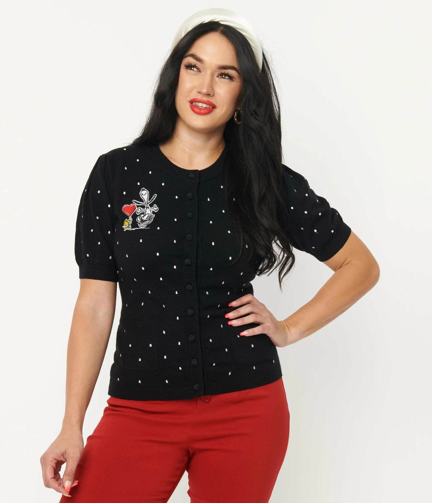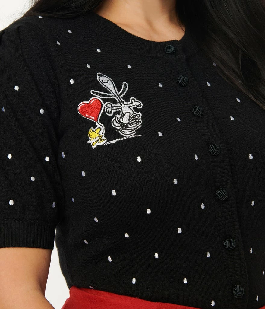 The staple of a good time, darling! This sweet black cardigan from Unique Vintage in collaboration with Peanuts boasts cute white embroidered polka dots throughout the soft sweater knit and a playful embroidered patch of Woodstock and Snoopy dancing. The Telluride Cardigan features a button up front and a modest scoop neckline, framed by charming short sleeves and complete with front pockets!