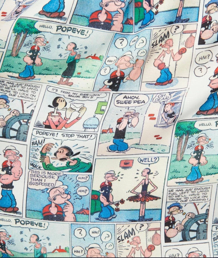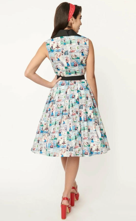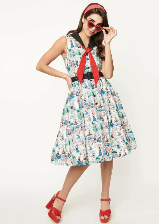 A fabulous swing dress in collaboration with the iconic Popeye the Sailor Man, this piece is crafted in a lightweight woven fabric and boasts a vintage print of the classic comic strip throughout. The button up bodice is secured with a removable neck tie while a belt and side pockets complete this outfit.