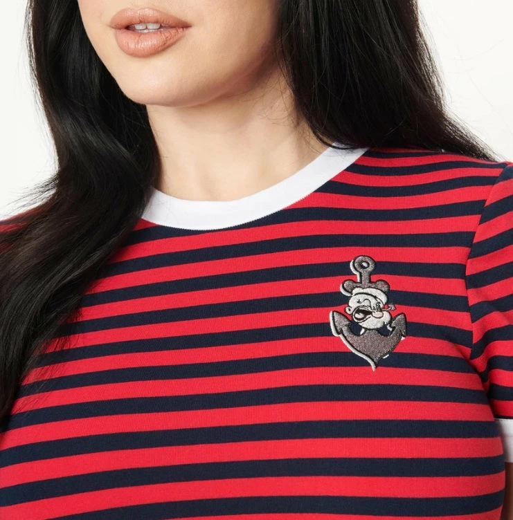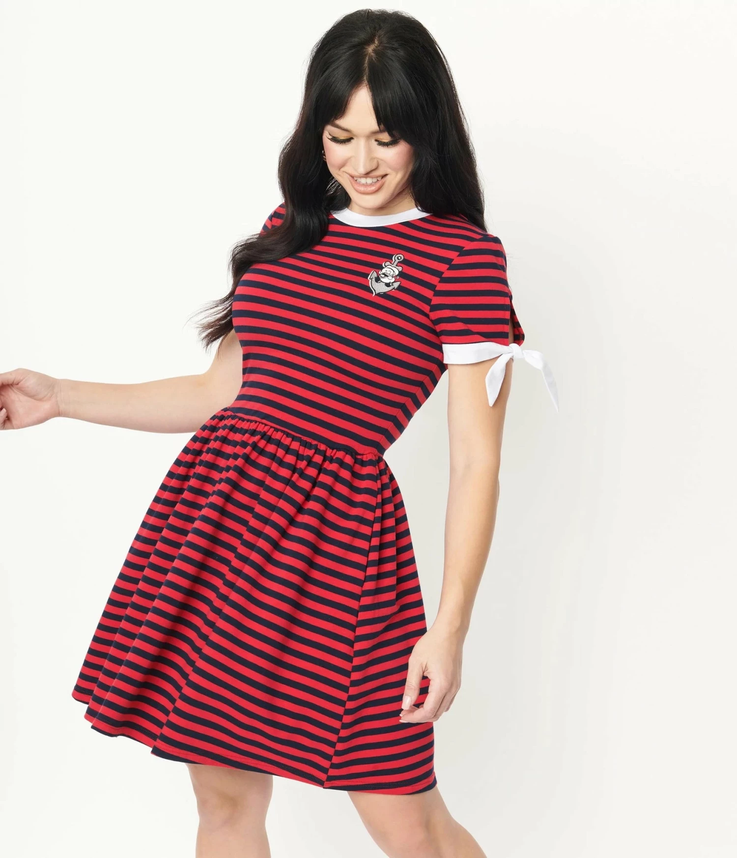 Sail the high seas with this charming piece from Unique Vintage in collaboration with Popeye, crafted in a marvelous red and navy striped jersey stretch for fun time frolics. The crew neckline is highlighted in white and framed by sweet short sleeves, outfitted with white self tie cuffs for a sweet keyhole while the bodice features an embroidered Popeye and anchor detailing. The elastic waist nips in your figure as the gathered flare skirt dances high above the knees, complete with side pockets.