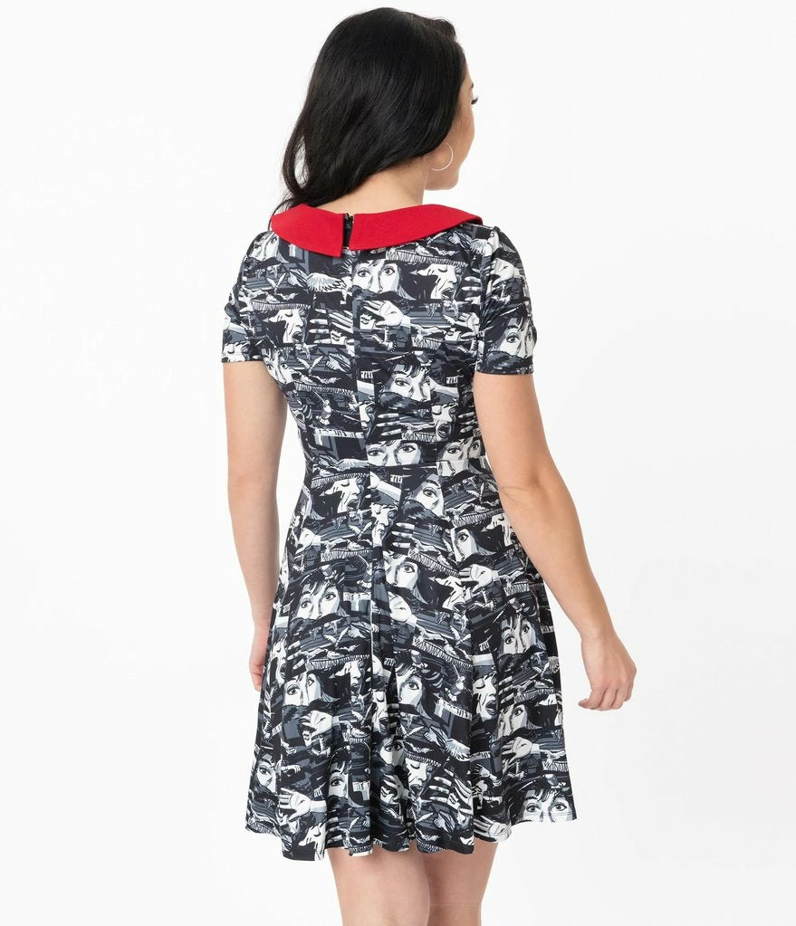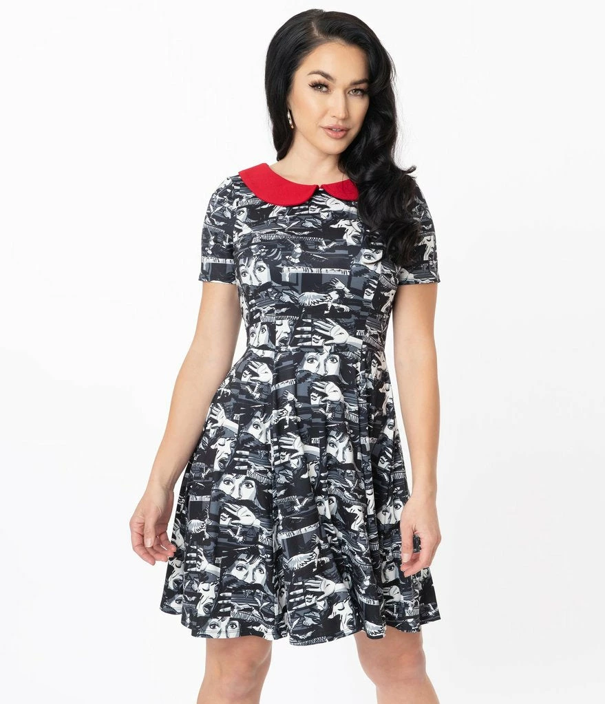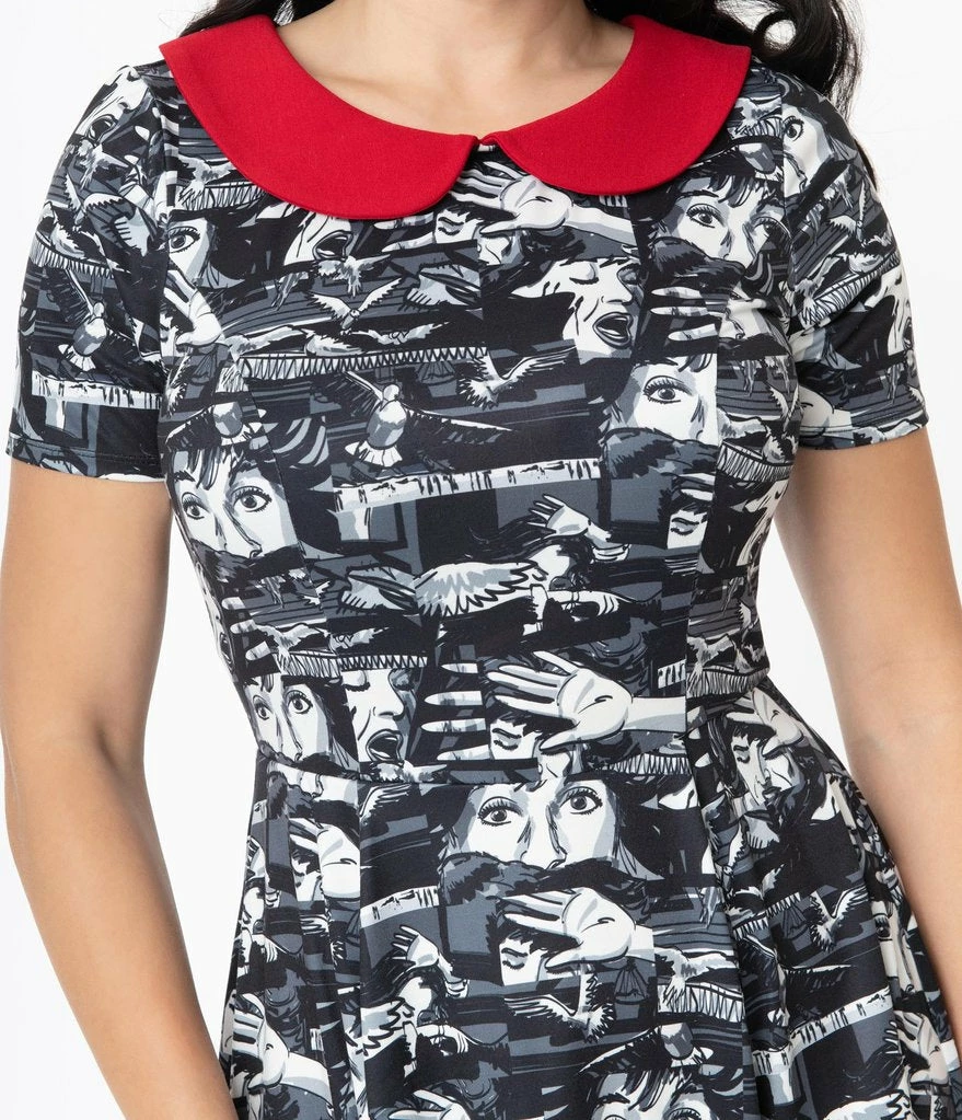 Sheer stabbing shock! An essential flare in homage to Alfred Hitchcock’s The Birds, the Margot Dress from Unique Vintage is a classic frock ready for a scream. Crafted in a silky stretch blend, the terrifying black and white print features a collage of scenes from the infamous bird attacks. Princess seams give a flattering fit for fabulous pin-up posing while the modest neckline is highlighted with a solid red collar and sweet short sleeves. Seamed at the waist and outfitted with a back zipper, the delightful skater skirt lends a cute A-line frame as it flutters above the knees!