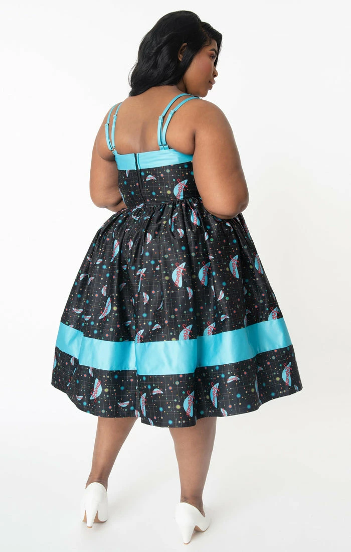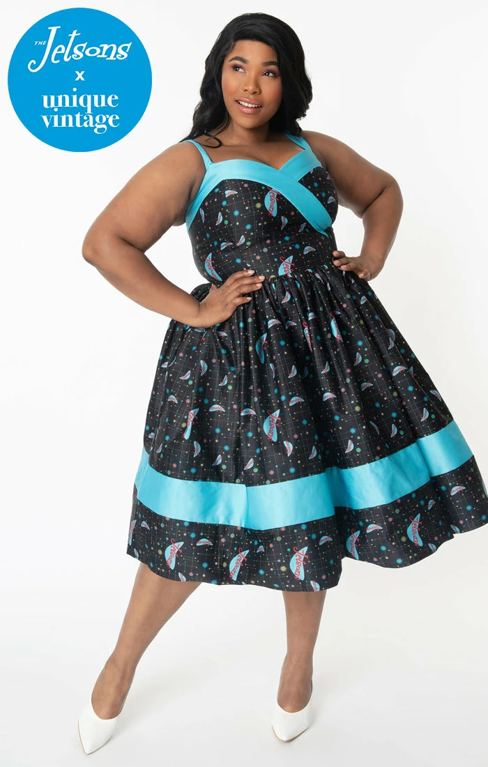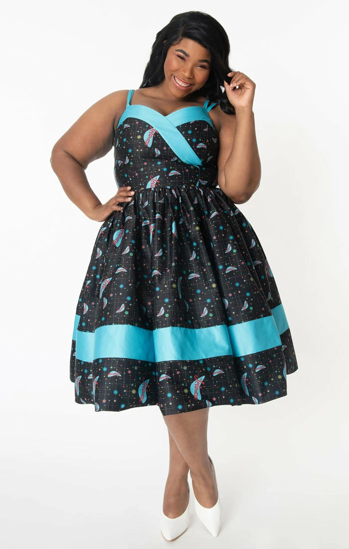 From here to the stars, dears! This gorgeous galactic swing dress from Unique Vintage is a plus size pin-up perfect frock in collaboration with the Jetsons, complete with iconic logo printed throughout a retro cosmic print. The Darienne Dress boasts dual adjustable spaghetti straps to support a beautiful surplice sweetheart bodice, highlighted in aqua blue and dropping to a seamed waistline. The gathered swing skirt flows to a straight hemline, complete with hidden side pockets, while a back zipper nips in your figure. Itβs a whole new world!