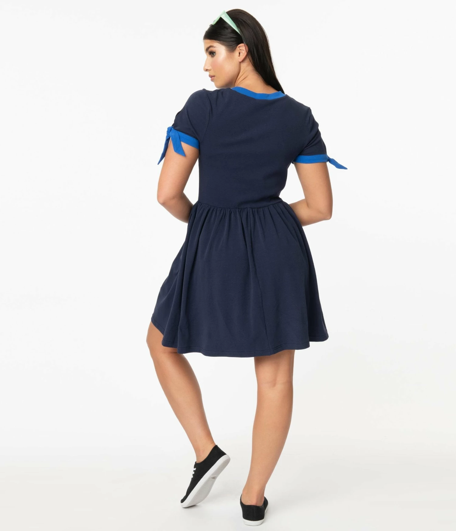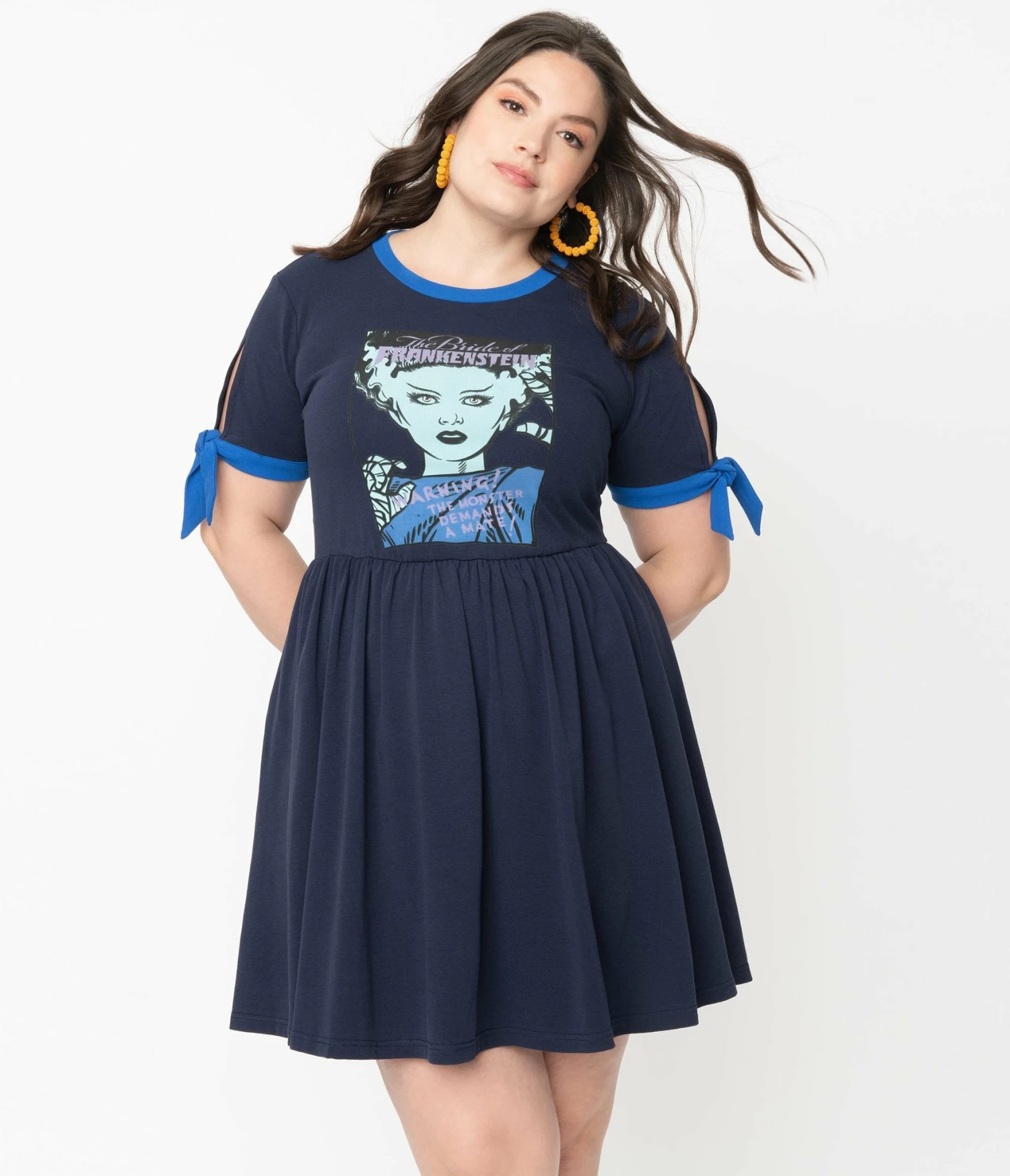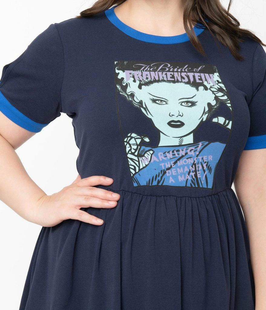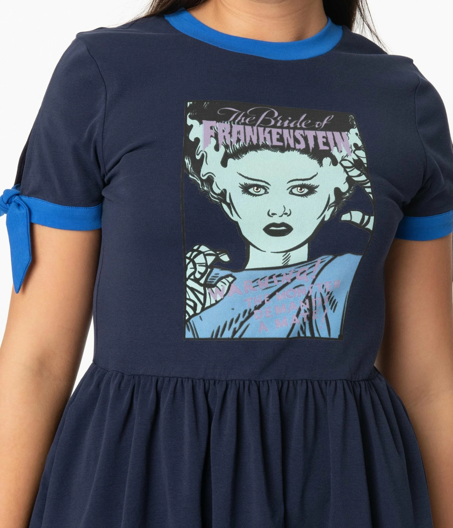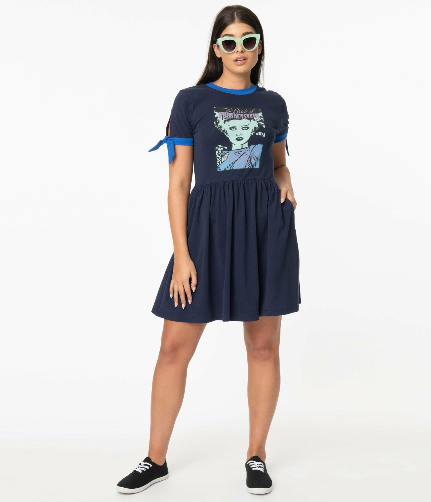 Drive them to the edge of madness, dears! Watch them tremble in your presence with this thrilling piece from Unique Vintage in hair-raising collaboration with Universal’s Monsters, crafted in a marvelous navy jersey stretch for frightening frolics. The crew neckline is highlighted in blue and framed by sweet short sleeves, outfitted with blue self tie cuffs for a sweet keyhole while a frightening screen print of The Bride of Frankenstein adorns the front. The elastic waist nips in your figure as the gathered flare skirt dances high above the knees, complete with side pockets for your movie snacks!