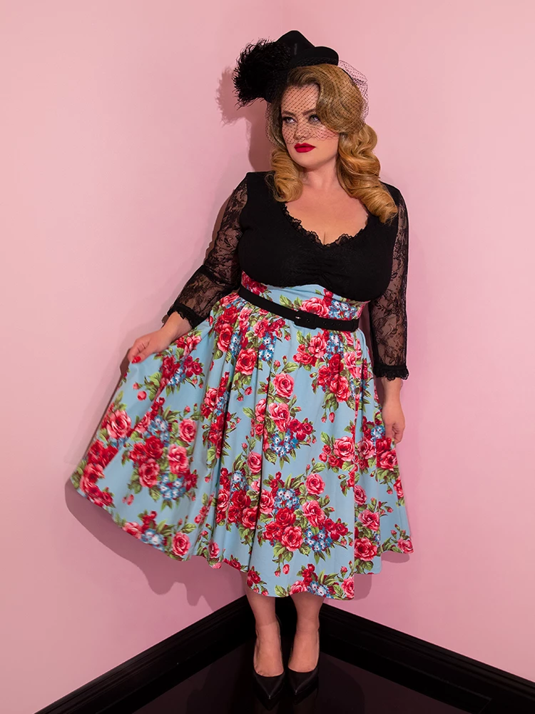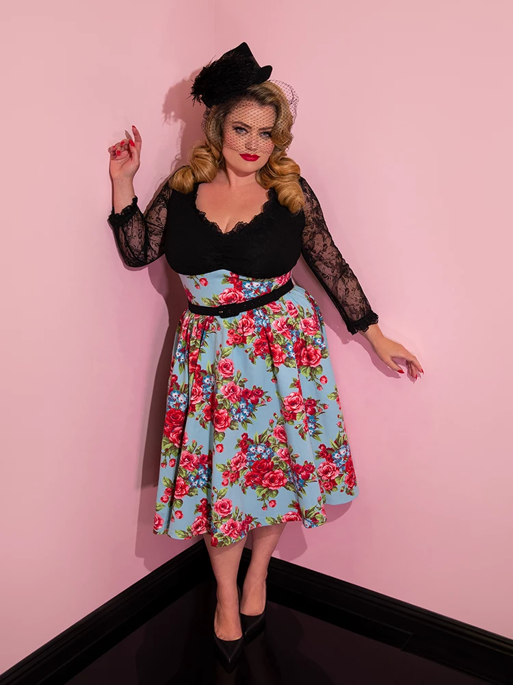 The Romantique swing dress takes its inspiration from Parisian aesthetic and design. This is original design has a bodice that is covered in an elegant stretch black lace with soft lace details along the neckline and sleeve. This dress is completely wrinkle resistant featuring a new rayon/poly/spandex fabric that features an original early 1950’s floral print. This dress has a unique cut on the bodice to showcase the femme form and a soft gathered skirt with our iconic Vixen pockets. This dress is finished with a back zip and a removable 1 inch black belt.